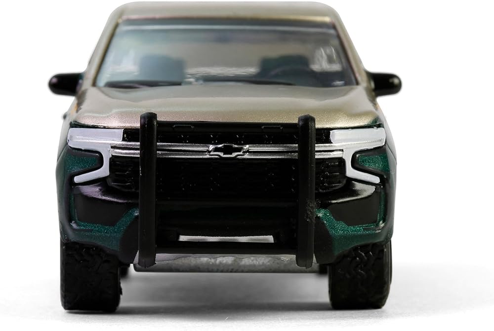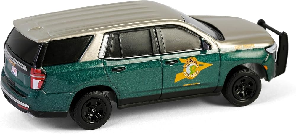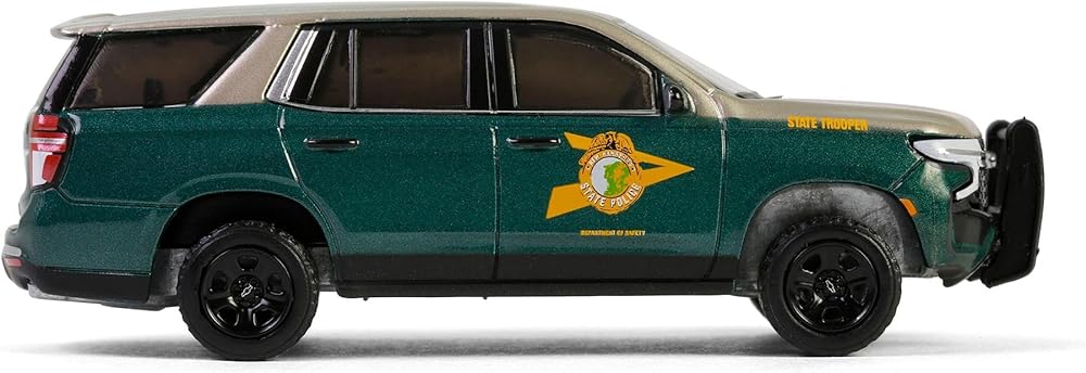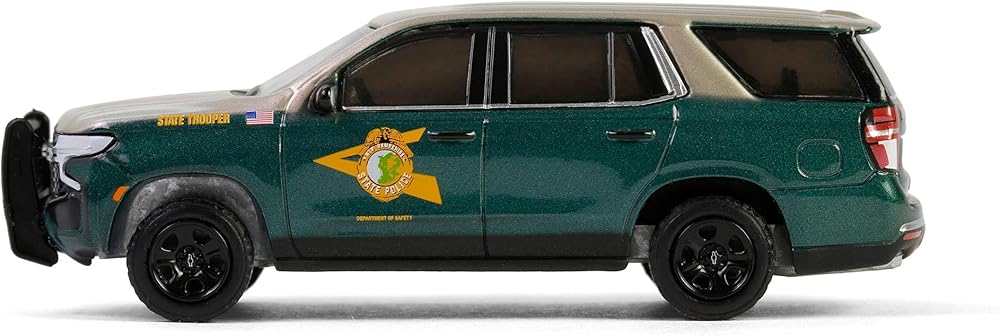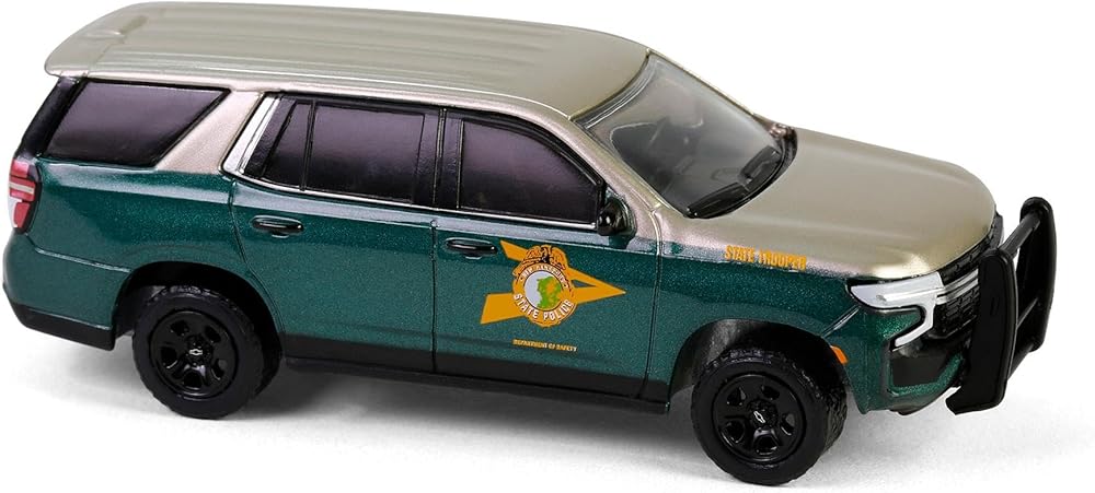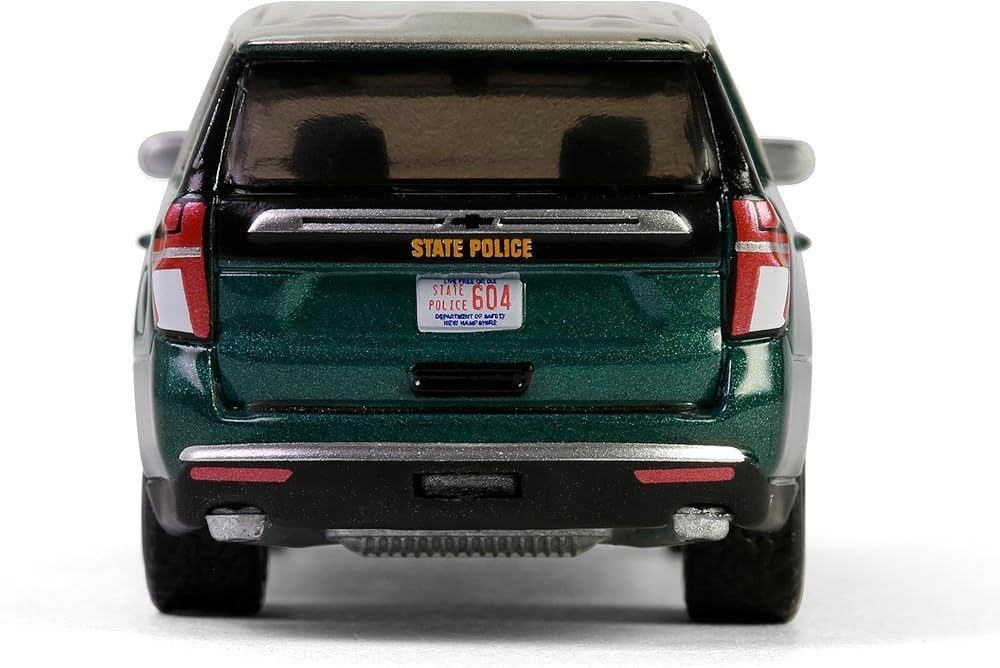 The 1/64 2023 Tahoe Police Pursuit Vehicle (PPV), New Hampshire State Police from Hot Pursuit Series 46 by Greenlight Collectibles is a stunningly detailed replica of the modern law enforcement SUV. Featuring a diecast metal chassis, rubber tires, and some plastic components, this model embodies precision craftsmanship. With its authentic New Hampshire State Police graphics, it measures approximately 3.25 inches long, 1.25 inches high, and 1.25 inches wide. Ideal for collectors aged 14 and up, this diecast is designed for display rather than play.
