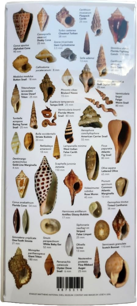 Official shell ID card of The Bailey-Matthews National Shell Museum in Sanibel Island, Florida. High quality images of 148 seashells found on the beaches of the southern Gulf of Mexico. Each shell has its scientific name, common name and average size. This 2-sided, tri-folded, laminated pamphlet is waterproof so it's safe to bring to the beach.