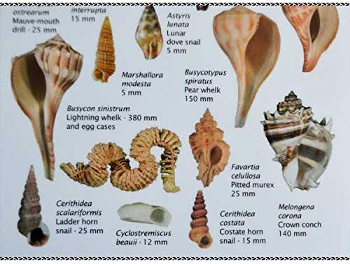 • Each shell has a color image (not to scale), scientific & common name, and average size