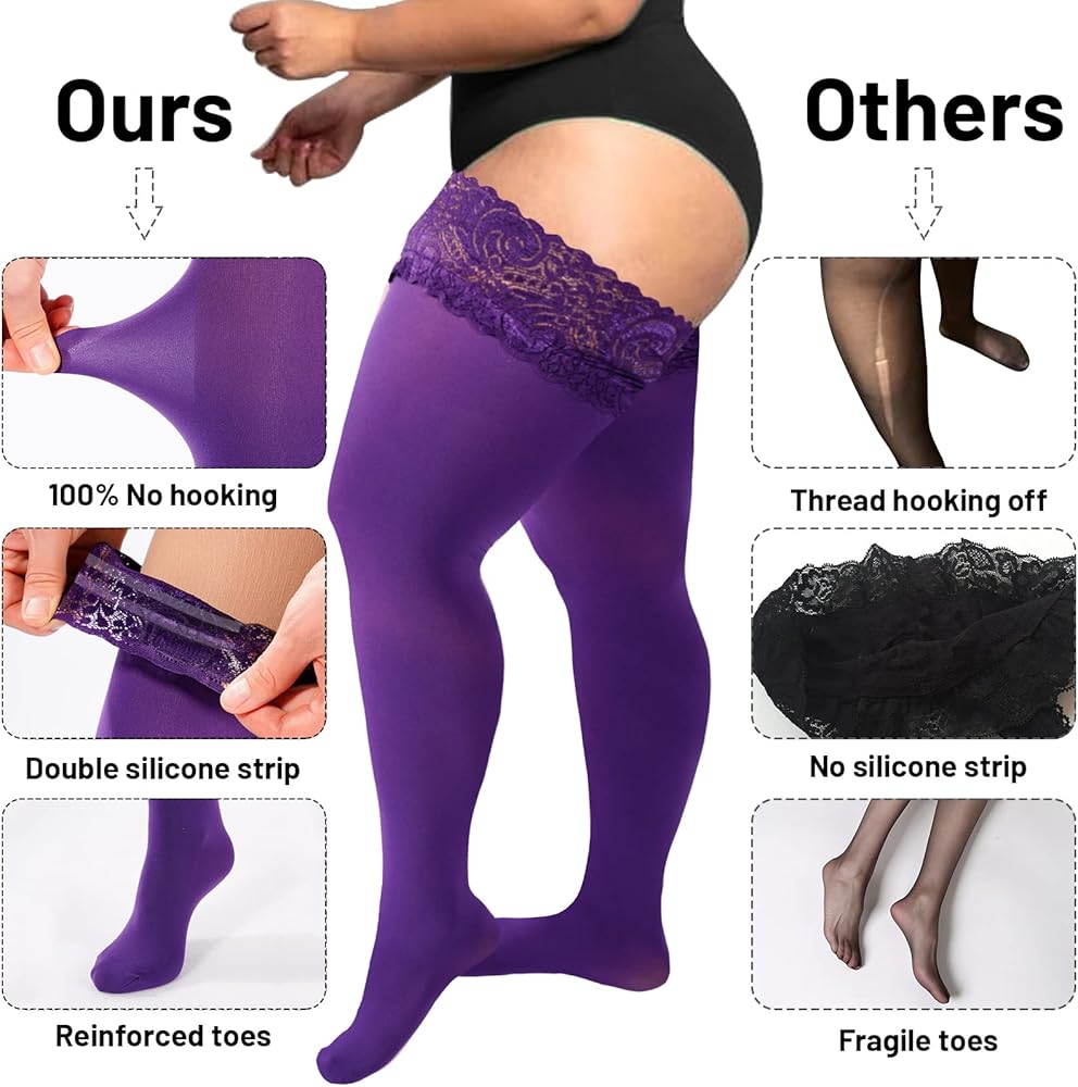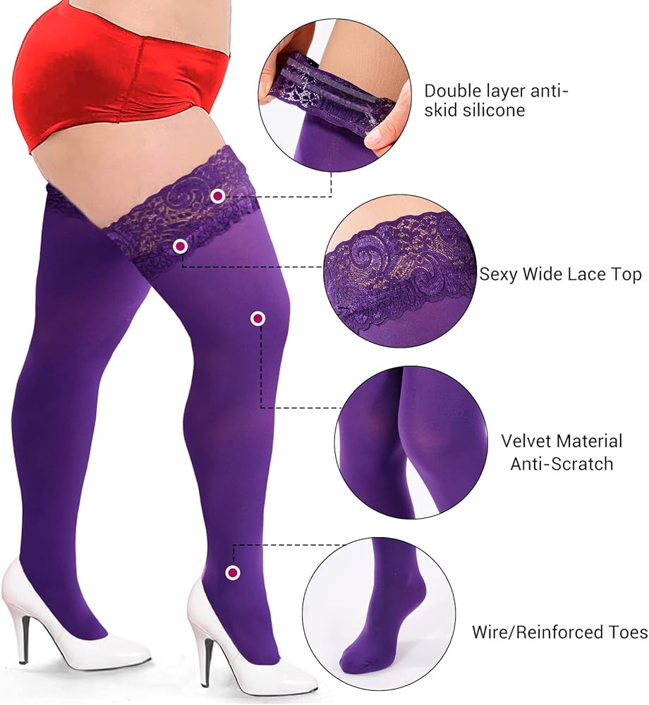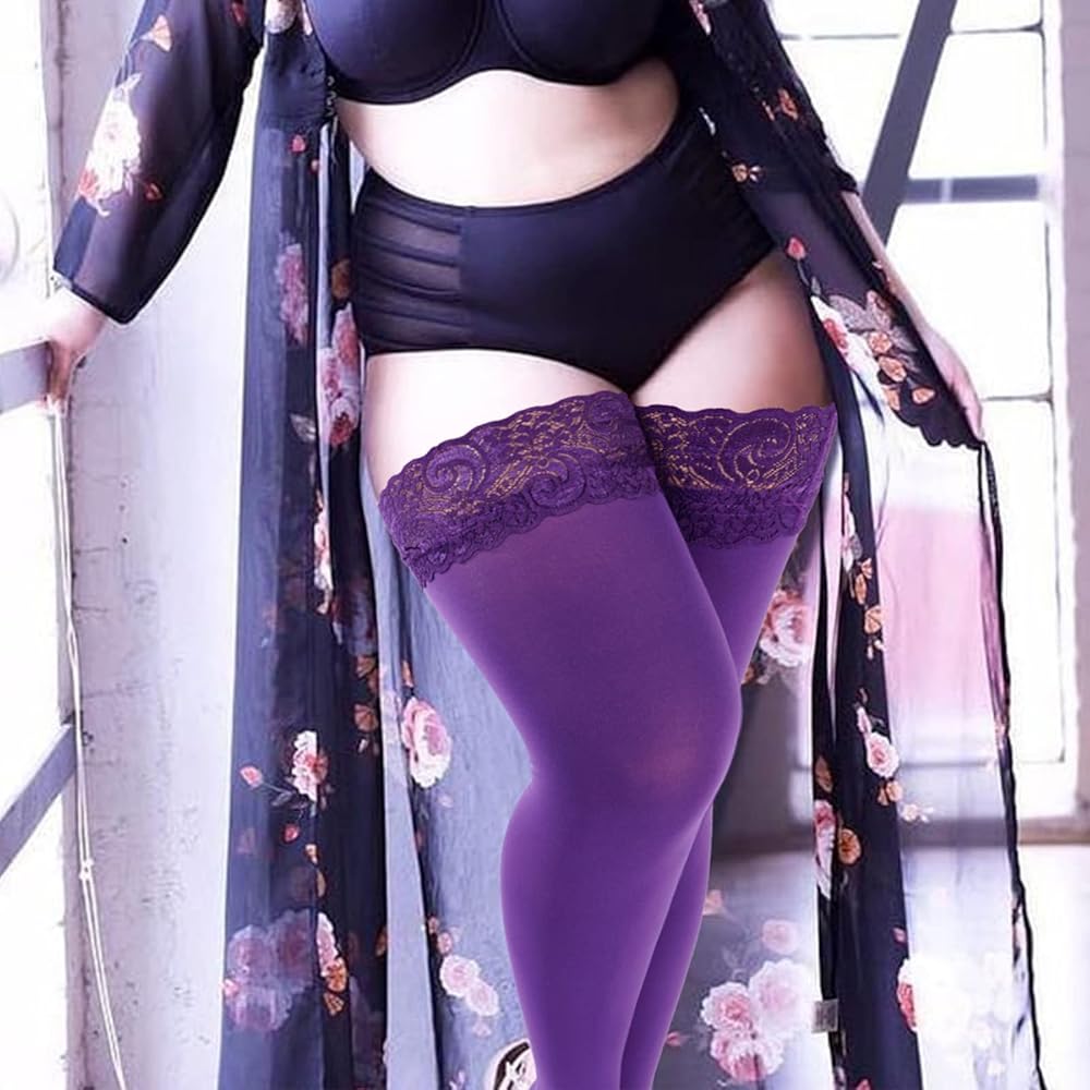 Say Goodbye to Embarrassment of Rolling Off. Our plus size lace thigh high stockings are made with 94% Polyamide, 6% Elastance don't hook silk and keep you and your legs comfortable and happy! Plus size stockings tops have non-slip drops of silica gel design to hold the sexy thigh high stockings and avoid slipping to the knees, the wide stretch lace top is beautifully patterned and can also decorate your legs and accentuate your shape.