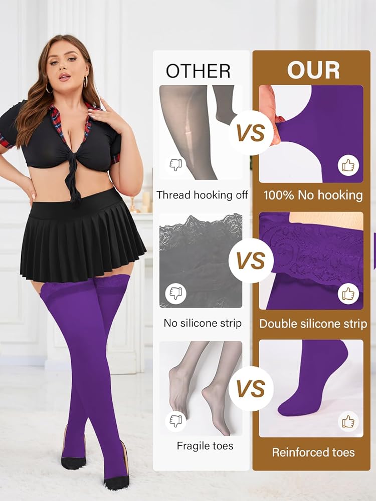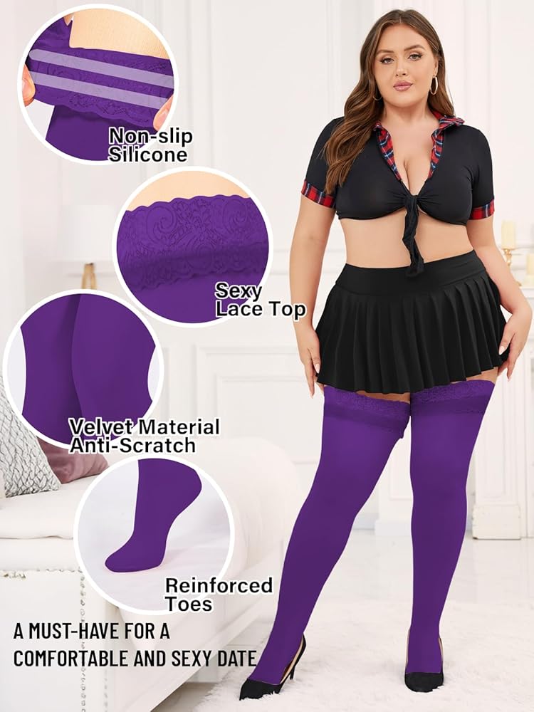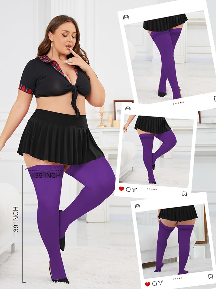 Various wear ways & show fashion. There are so many ways to wear our plus size over the knee stockings ease with a variety of outfits! Pair it with women lingerie, shorts or a mini pleated skirt in summer, or with thigh high boots or bare boots in fall or winter! You can also cosplay, roller derby, pole dance in our comfy socks, even while you're hanging out at home or out and about!