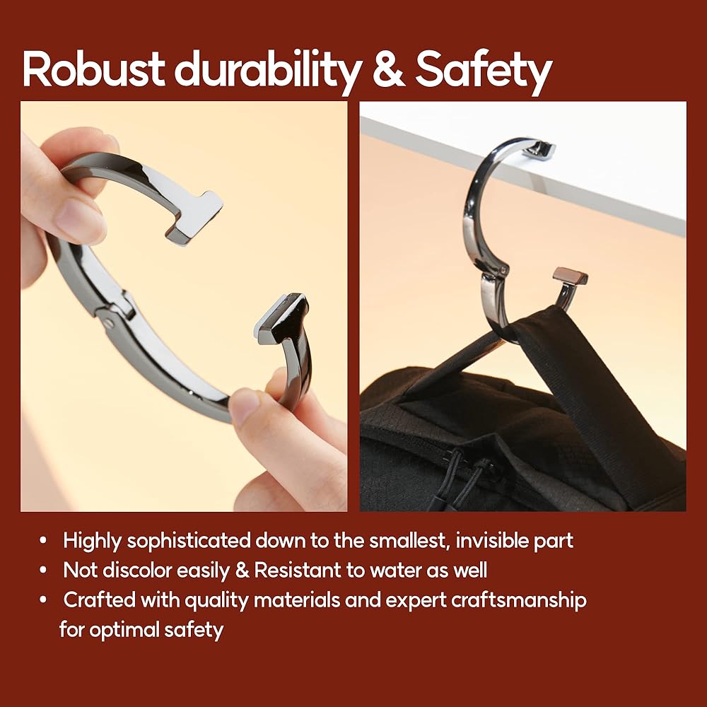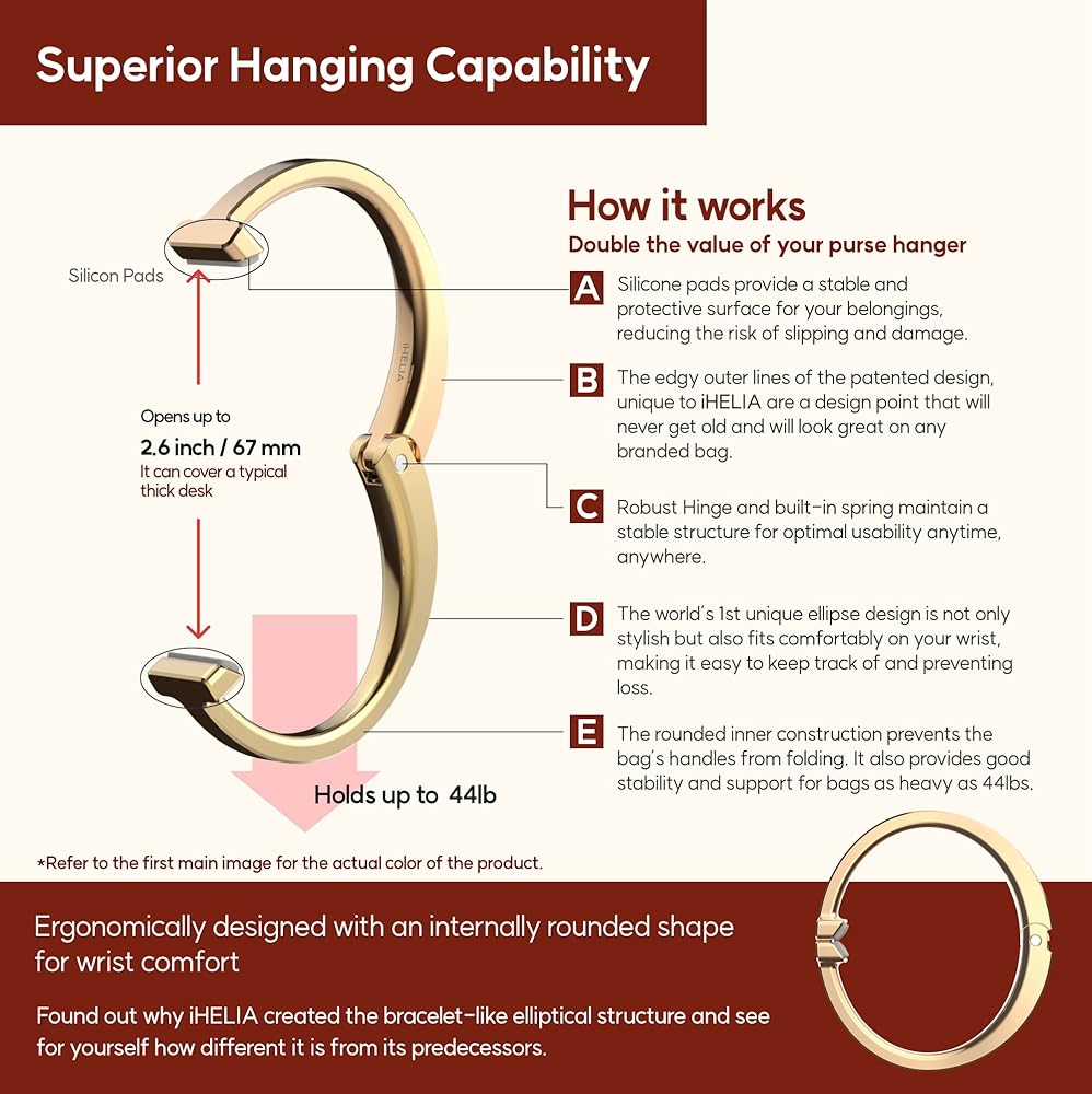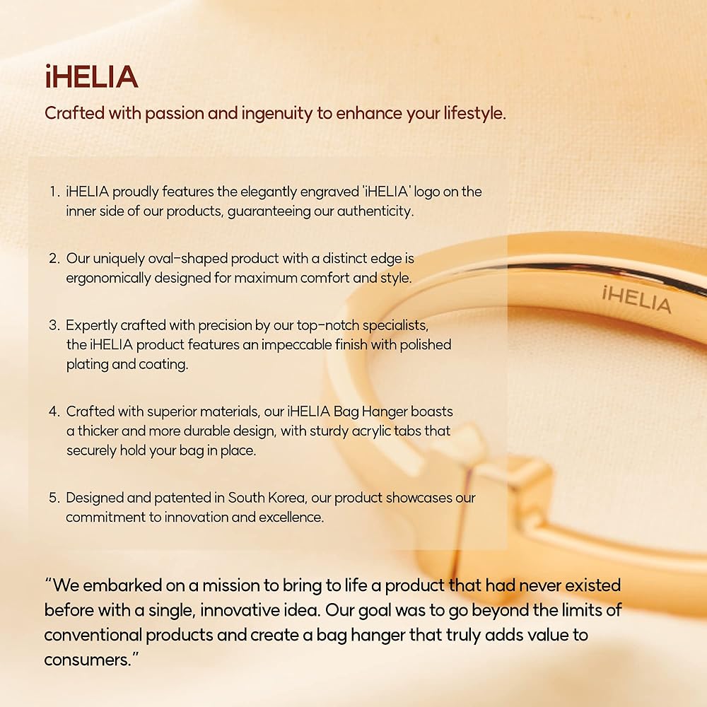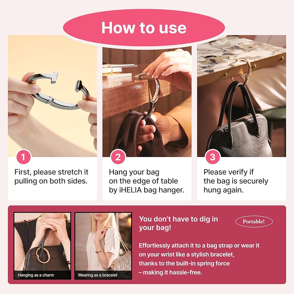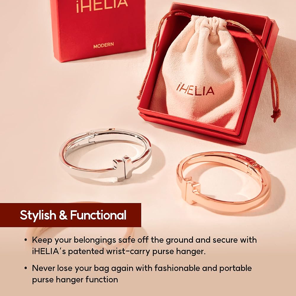 • ارفع أناقتك - قم بترقية حقيبتك باستخدام شماعة المحفظة العصرية من iHELIA للطاولة. تصميمها الفريد وحرفيتها العالية سيجعل حقيبتك مميزة وتبدو جديدة تمامًا.