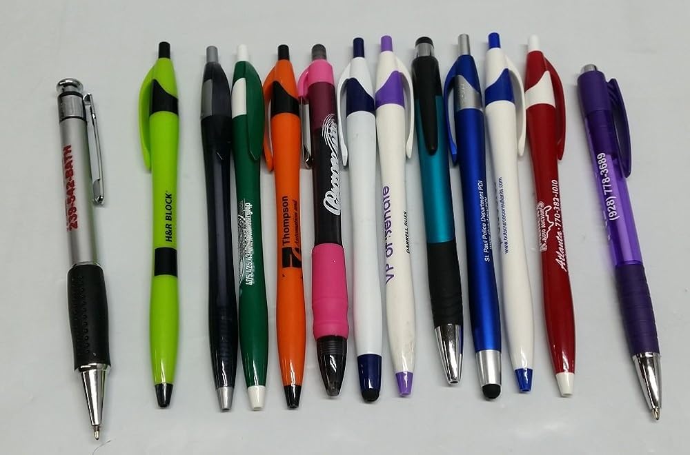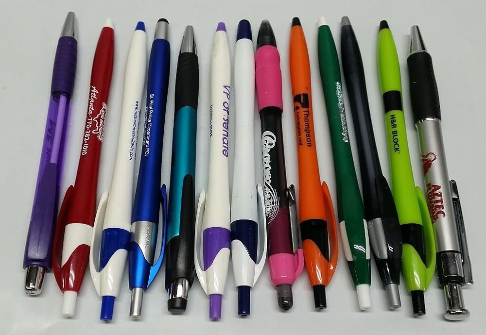Ignore the business names and logos on these miscellaneous misprints, and enjoy the smooth action of fine quality ballpoints at a bargain barrel price. Most have clips, and some even have a stylus for touchscreens. Quality ball point click pens w/ misprinted logos. Pens have black or blue ink. Bulk misprint pens - great deal for for writers, business, college, school. Multipurpose for home, office, work, art & drawings, teaching, journals & notebooks; Durable & reliable pack; convenient for adult men & women, teens, kids boys & girls, students, teachers & educators, church supplies and more. Most pens are 5.5”L x .5”W. 5-lbs Misprint Retractable Ballpoint Pens With Clips (Approx. 200 Pens), Assorted Colors & Logos. New bulk pen lot.