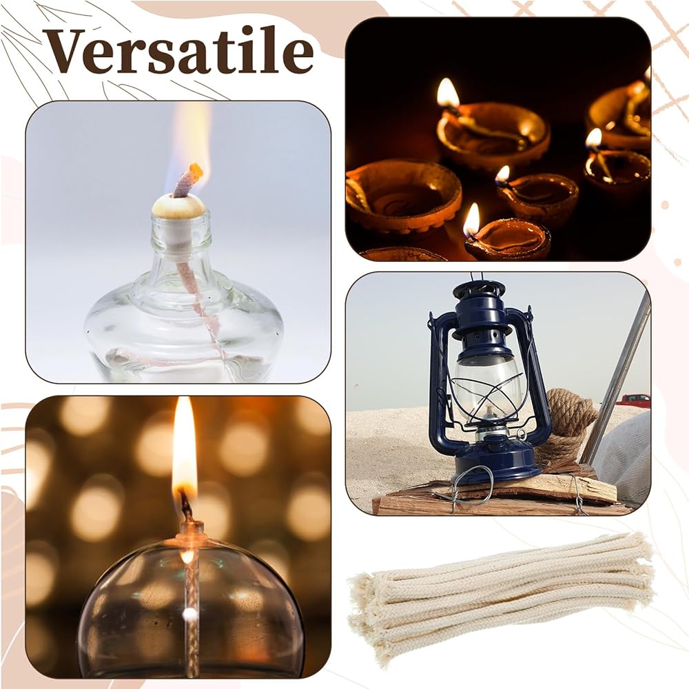 【Pure Cotton】Crafted from pure cotton, our oil lamp wicks offer a clean and eco-friendly lighting solution. Ideal for oil lamps, these wicks absorb oil efficiently, delivering a consistent and odorless flame for both indoor and outdoor use.