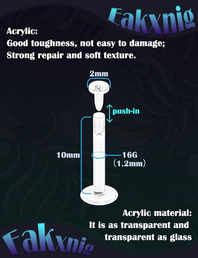 [Measurements]: Clear earrings for work sports 16g(1.2mm); bar length : 1/4"(6mm), 5/16"(8mm), 3/8"(10mm), 1/2"(12mm); Flat back Push on clear lip rings top: 3mm;