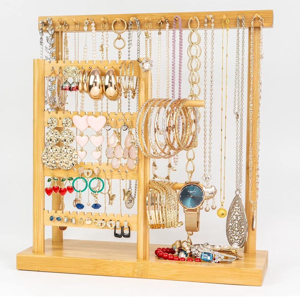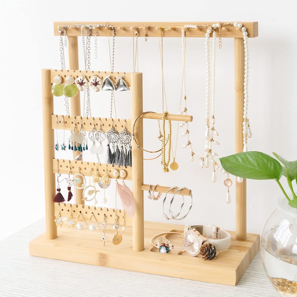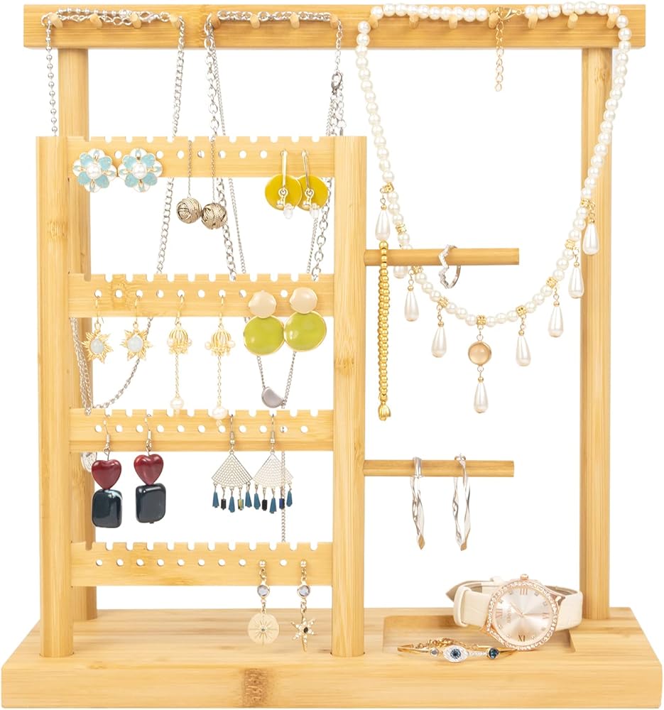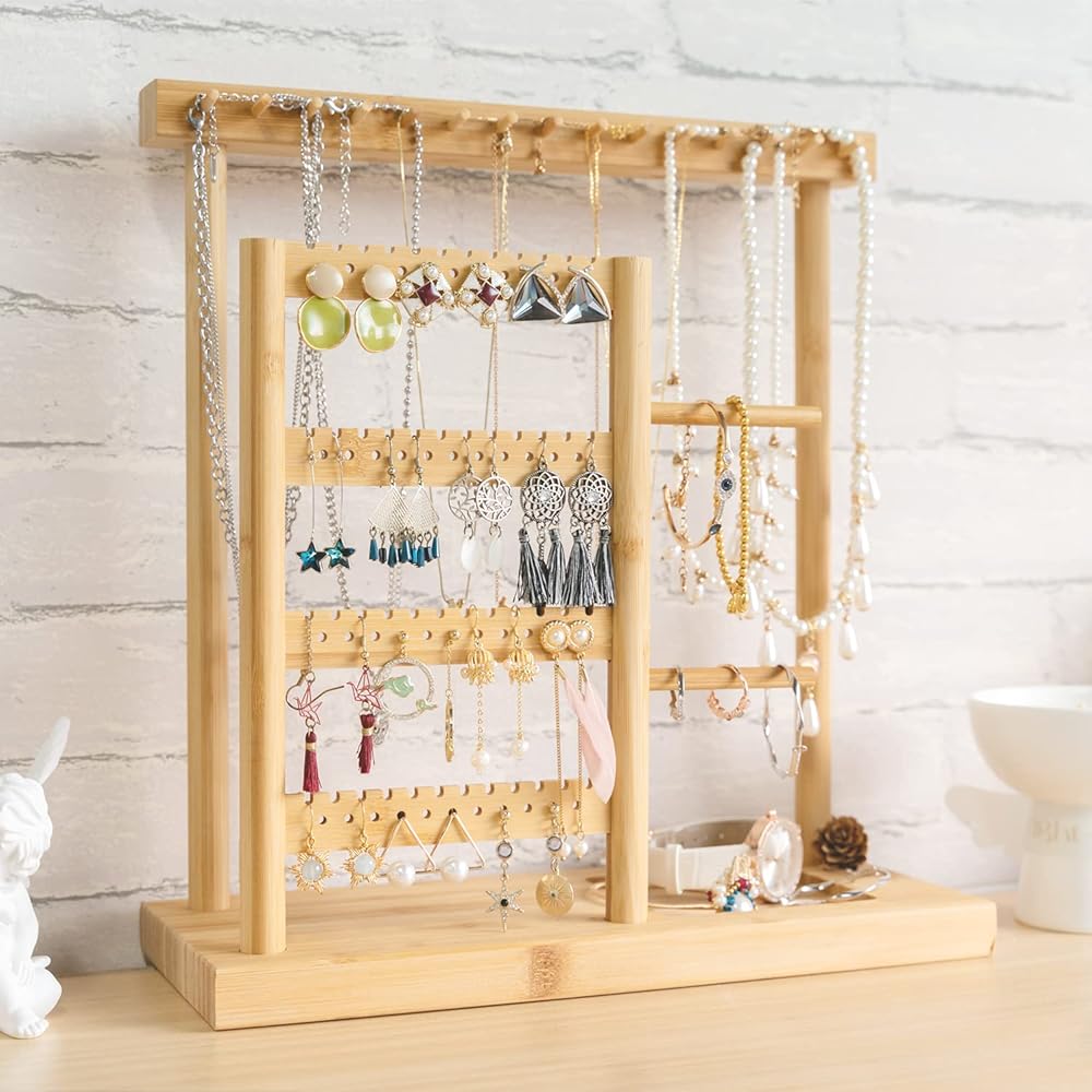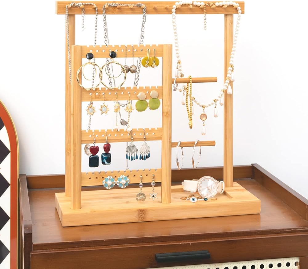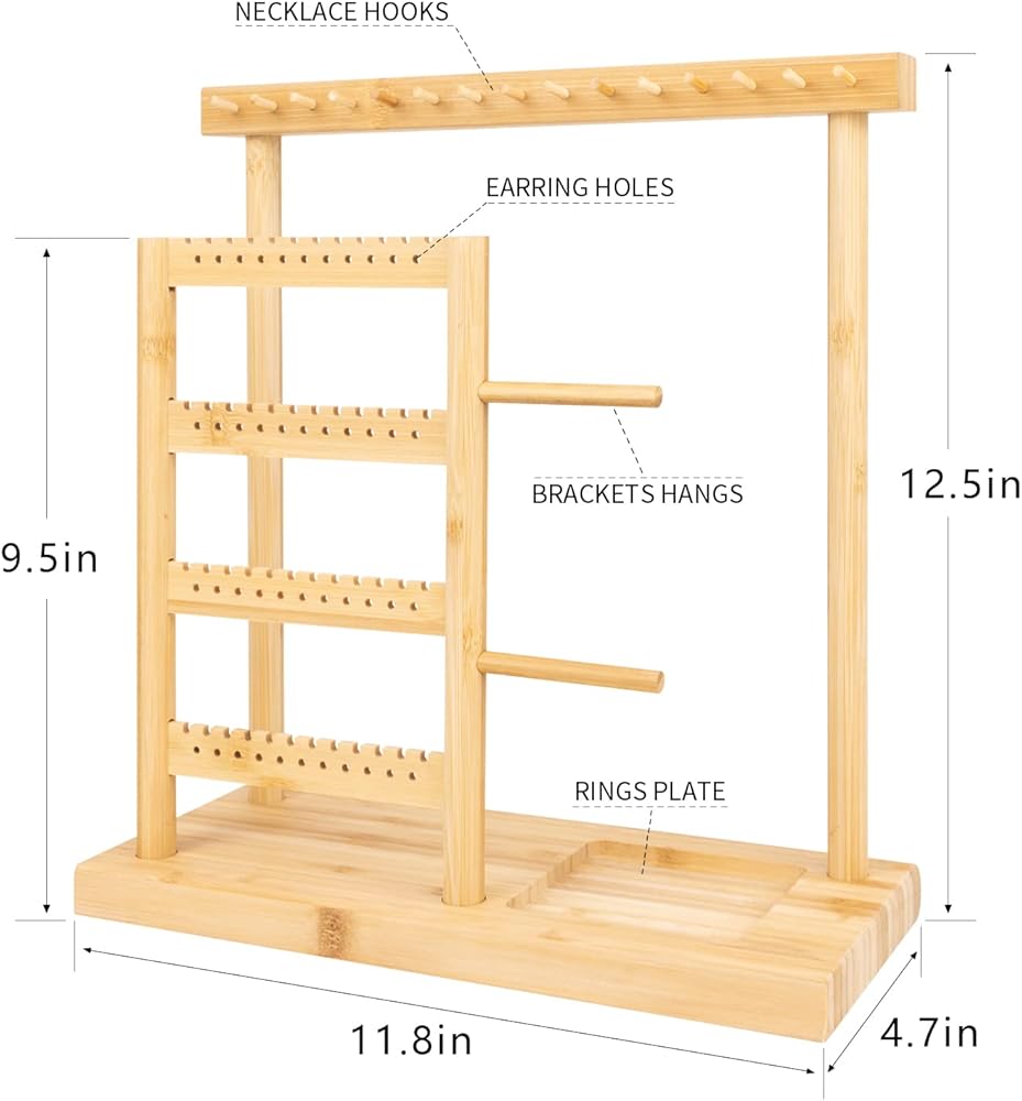 3. قوي وثابت: يمكن لحامل الخيزران هذا الحفاظ على جميع قطعك معلقة بأمان، وتخزين وتنظيم الأقراط والقلائد والخواتم والأساور وما إلى ذلك.
