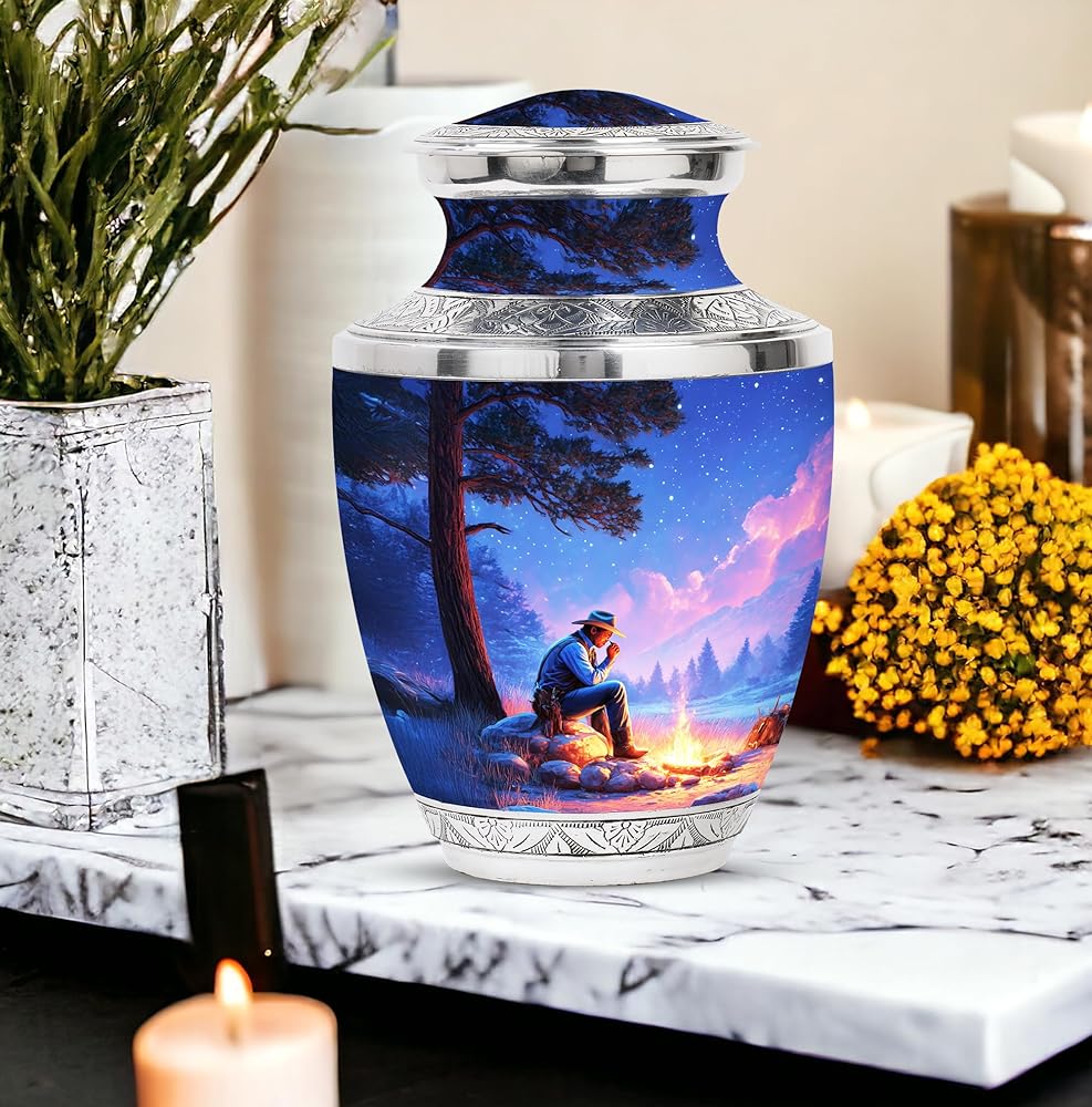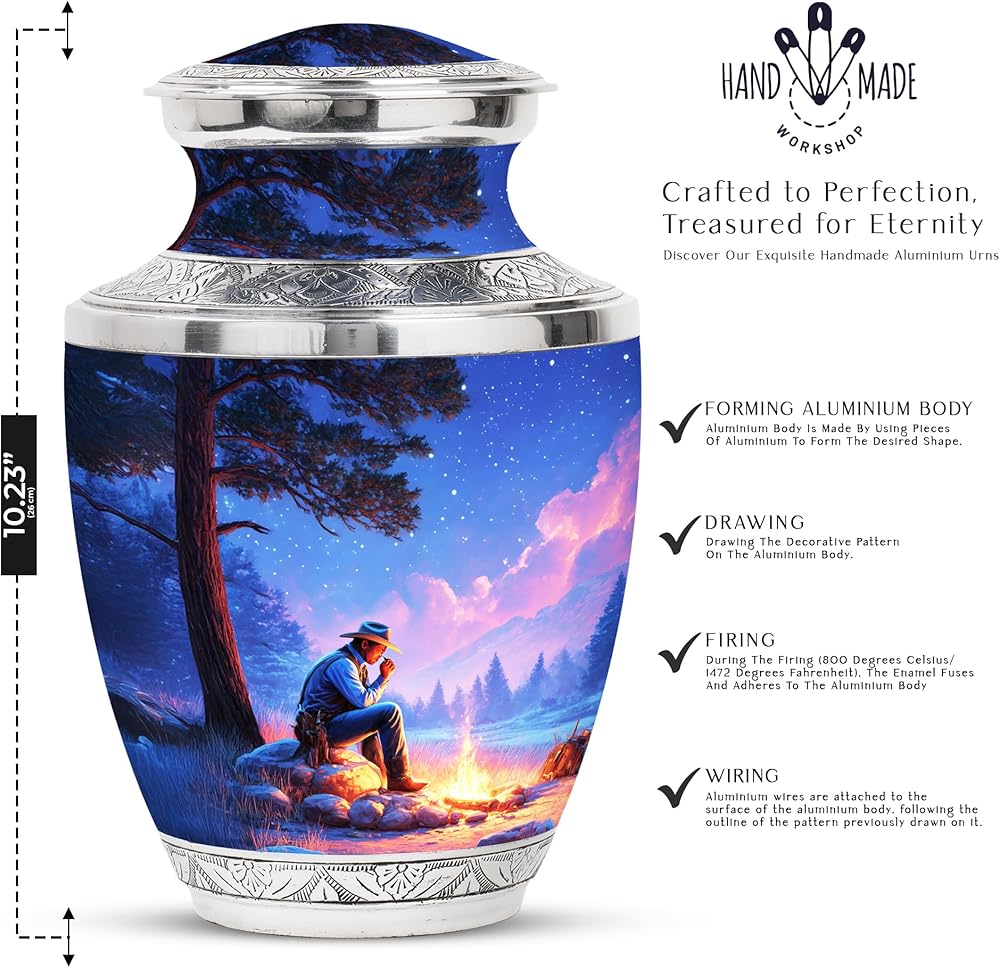 جرة حرق الجثث للرماد البشري - تتم مصنوعة من جرة الدفن المصنوعة يدويًا من الألمنيوم القوي من قبل فنانين ماهرين ، يظهران نوعية جيدة بكل التفاصيل. تصميمه الأنيق وجر جوز الجزية التي تحمي الرماد الرجال بينما تظهر فنًا وحبًا حقيقيين.