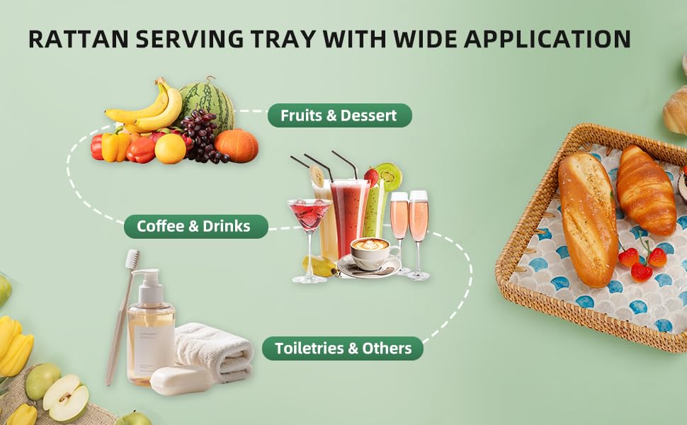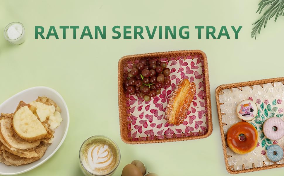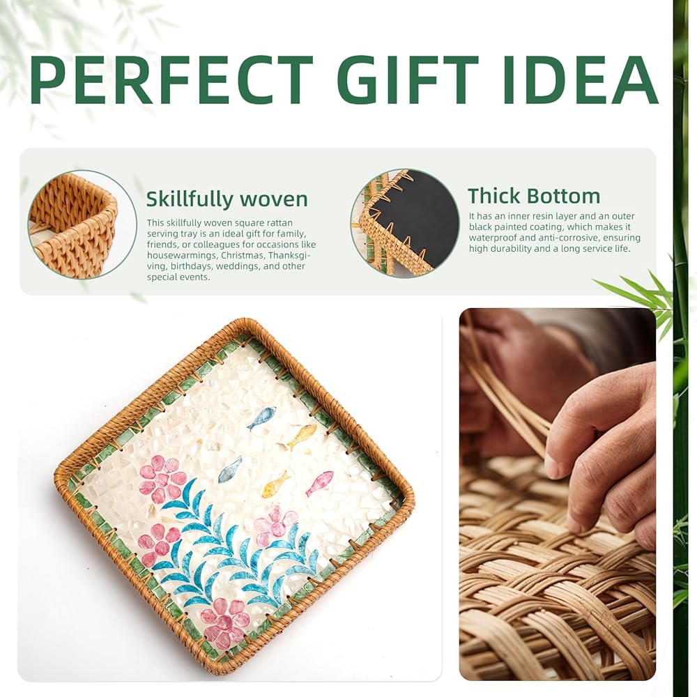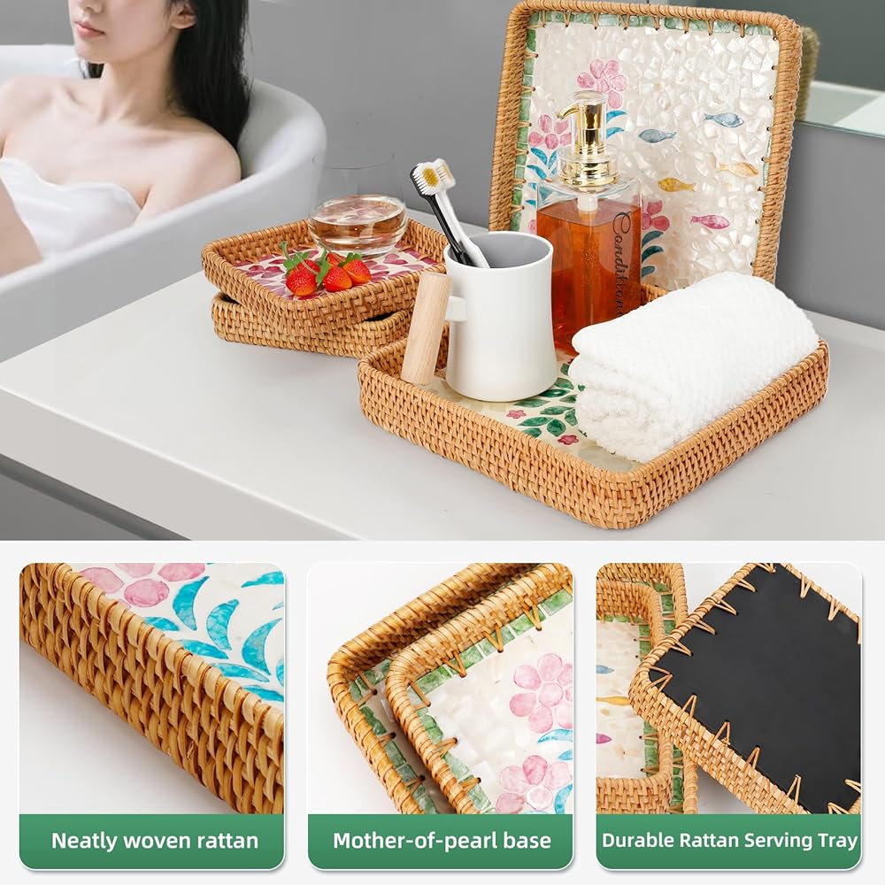 صينية الروطان مع ترصيع اللؤلؤ، ديكور طاولة القهوة بوهو، صينية تقديم مزخرفة، هدية المزرعة لغرفة المعيشة والحمام