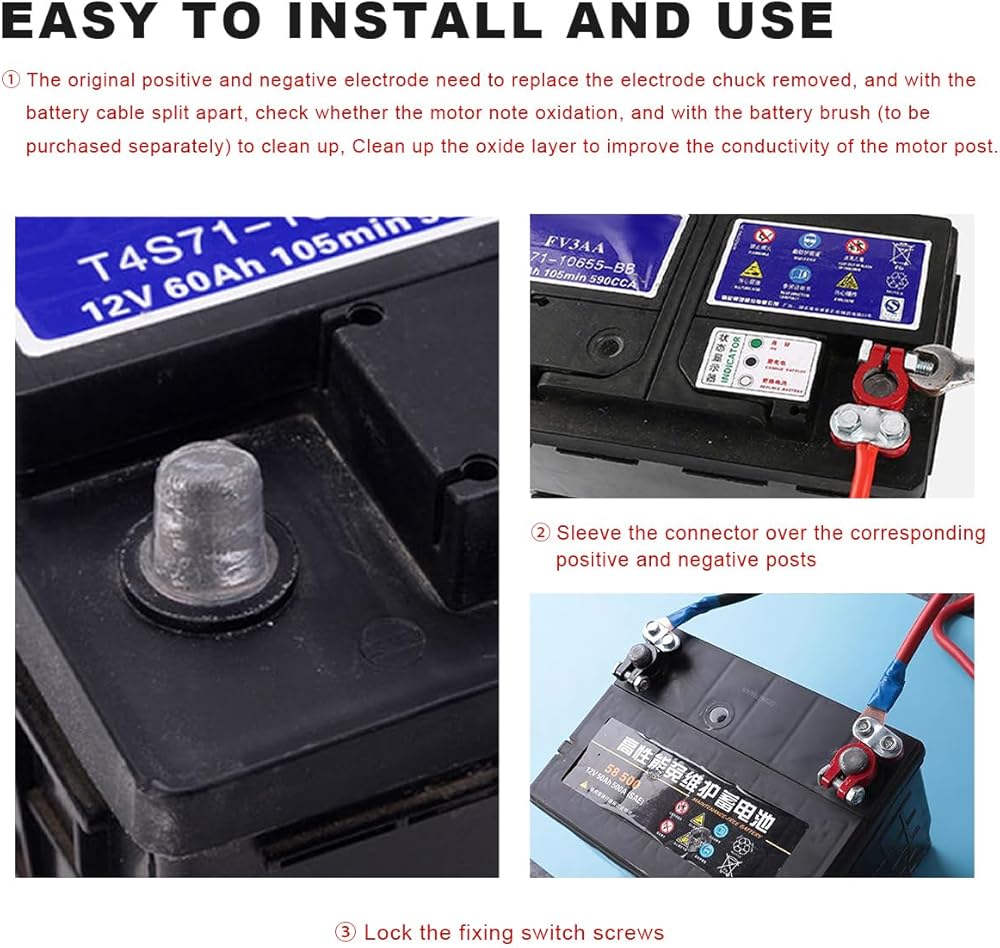 【Installation Instruction】: Before installation, you need to make sure that the battery terminals are clean and free of rust and corrosion, if necessary, use sandpaper to sand them. Secure the battery cables to the connectors and fit the connectors to the terminals.