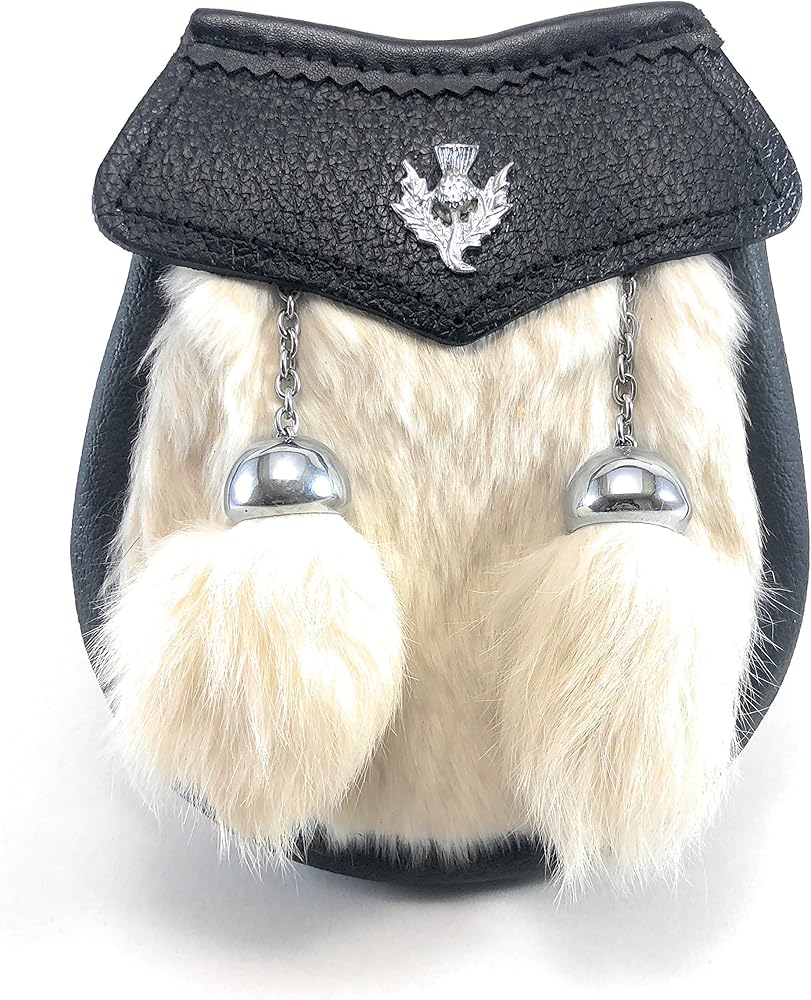 Genuine Fur Baby Kilt Sporran with Chrome Thistle Badge and Two Tassels. Baby/Child Kilt Sporran Available in Black and White Fur. Scottish & Highland Child's Kilt Sporran with Thistle Badge and Tassels. Scottish Kilt Sporran Baby Thistle Badge Chrome Finish. Free Sporran Leather Belt & Chain. Leather Sporran Bag use Key rings, Reeds, & other small items Looks great with or without a kilt & perfect accessory for a bagpipe. Great value for your Money.