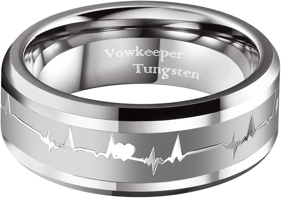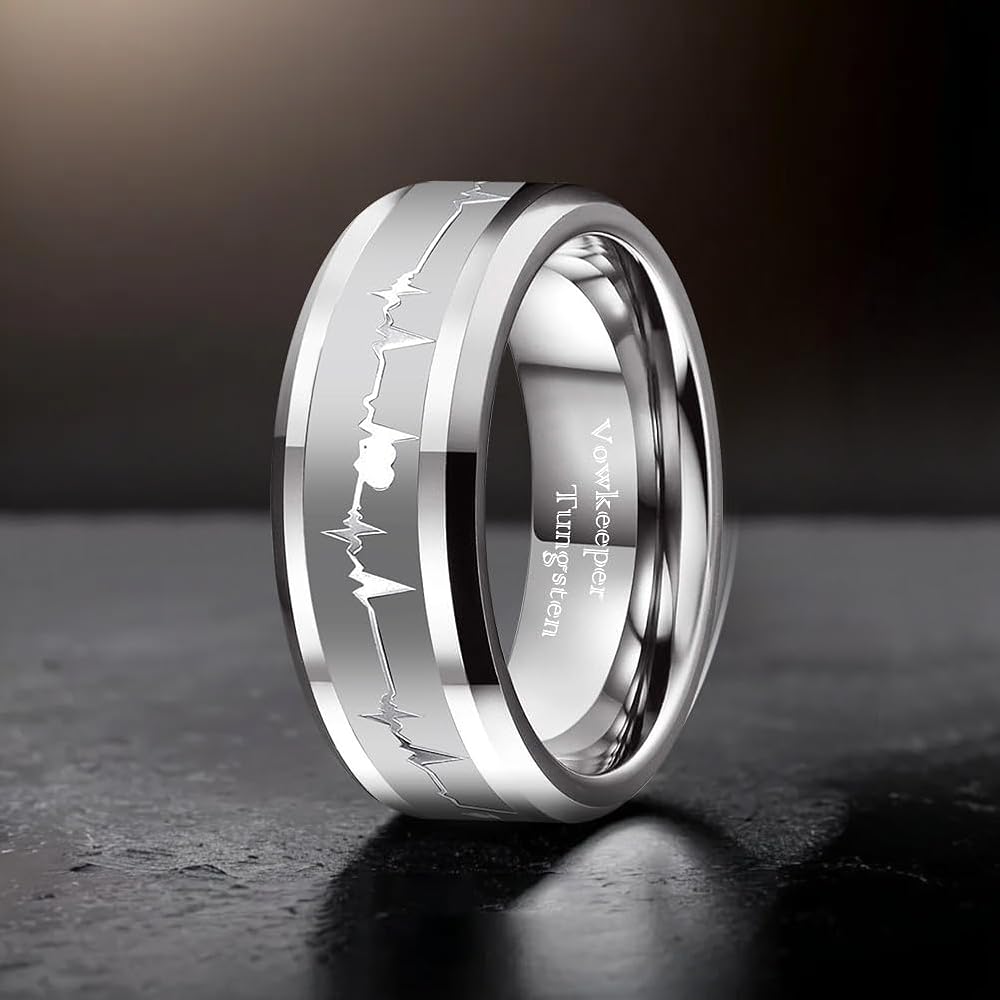 تصميم ترصيع نبضات القلب الفريد من نوعه هذا خاتم زواج التنغستن الأسود 8 ملم مرصع بنمط نبضات نبضات أنيقة ، يرمز إلى الالتزام. يوفر التصميم لمسة حديثة وذات مغزى لحفل الزفاف الخاص بك ، أو رنين الوعد. 2. Premium التنغستن الحرفية