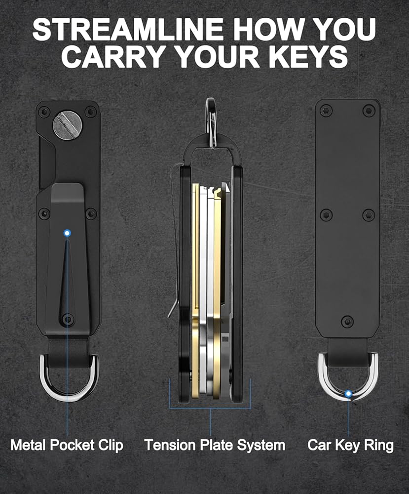 CONVENIENT STEEL POCKET CLIP: Unlike other inconvenient key organizers, The Smart Key Holder comes with a top of the line clip that allows you to keep your keys out of the way in your pocket. Allowing for more versatile forms of storage needed by today's adventurers and nomads, it pairs beautifully with modern day car key fobs on a single key ring connection.