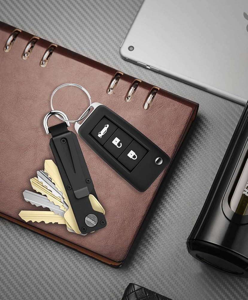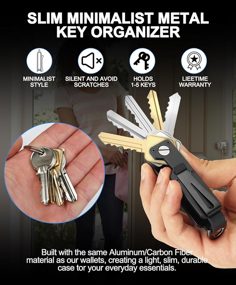 SILENT. SLEEK. SLIM. : TUXON Compact Key Holder is minimalist without being limiting. It's about carrying less but always having what you need. Getting rid of pocket bulges, keys poking holes through your pants, or jangling sounds while featuring a game-changer design.