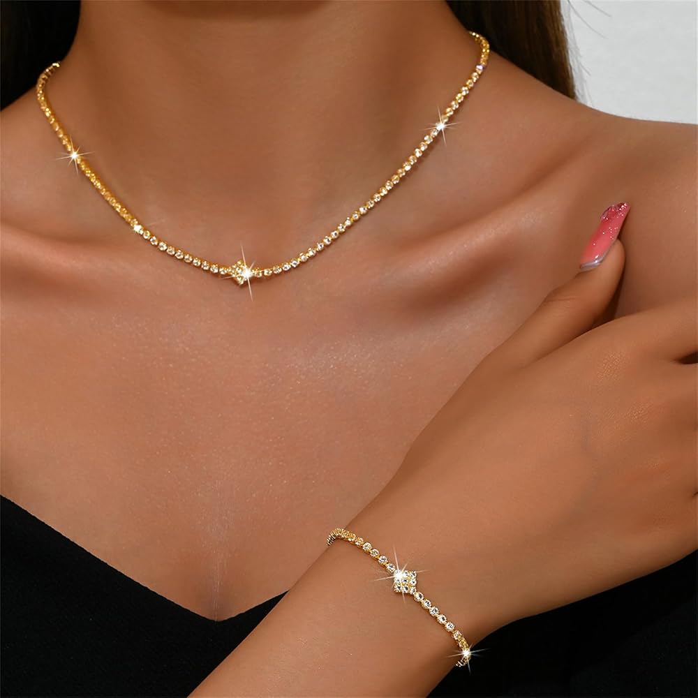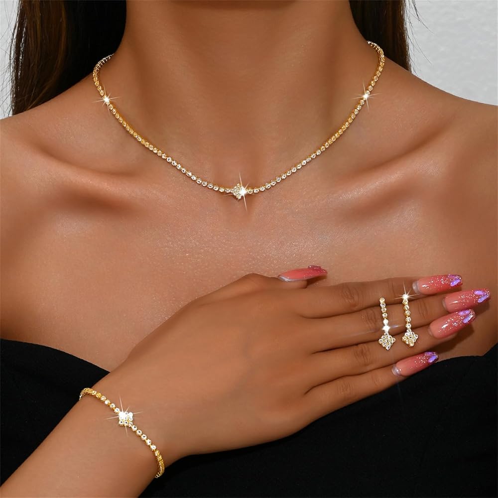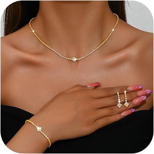 Rhinestone Bridal Wedding Jewelry Set for Women,Dainty Sparkly Crystal Statement Choker Necklace Earrings Bracelet Set Bridal Wedding Prom Jewelry Accessories