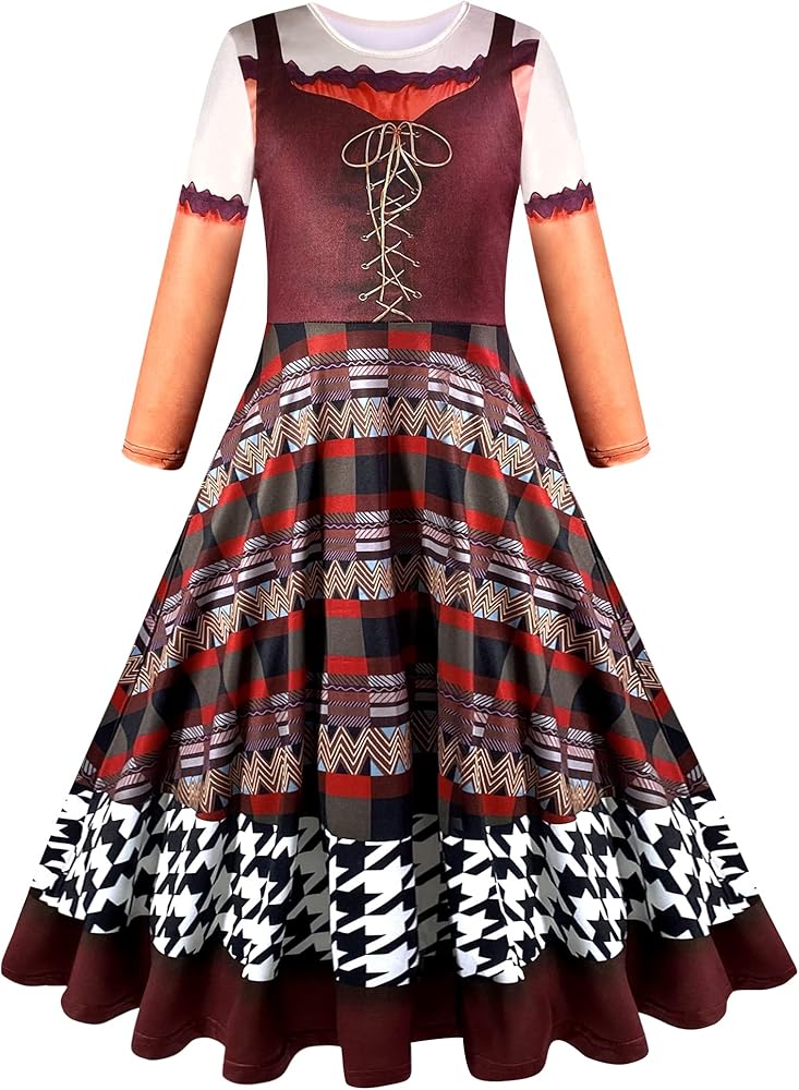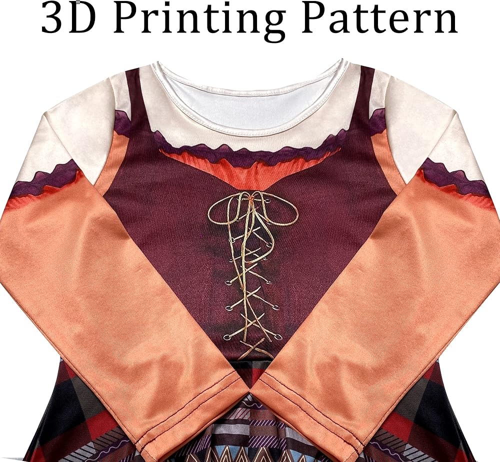🧙♀️Design - Girls Sarah Winifred Mary Sanderson costumes are available for girls from 4 to 11 years old, features beautiful colorful print, round neckline, easy to put on.
