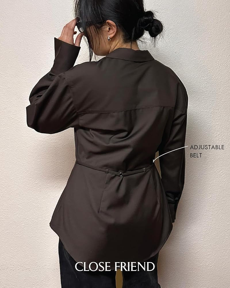 التفاصيل: الخصر قابل للتعديل مع حزام متصل في الخلف لإلقاء نظرة مجهزة أو مريحة. أكمام طويلة مع الكفة.
