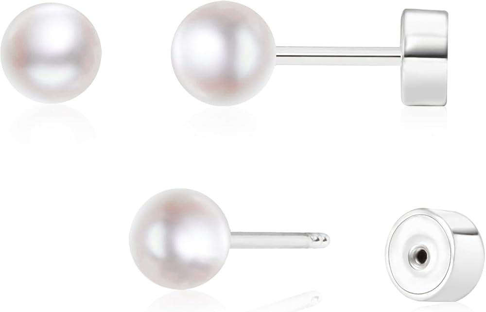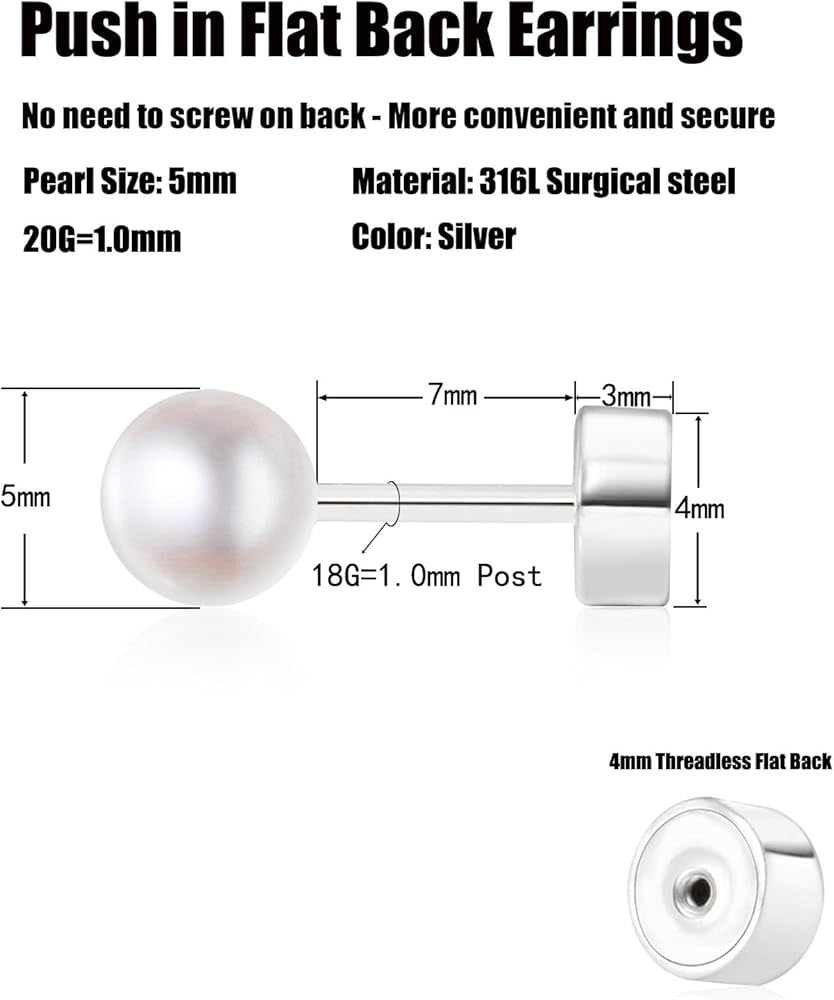 Threadless Flat Back Earrings - Pushback Earrings These 5mm gold pearl earrings use push back flat back design, non-screwed, easier put on and take off. These threadless flat back earrings are considered safe for all ages. Unlike other types of earrings that have a post with screw back earrings butterfly back earrings or friction back, threadless flat back earrings have a flat, no-screwed back that push into the earring post and won't poke the back of the head.