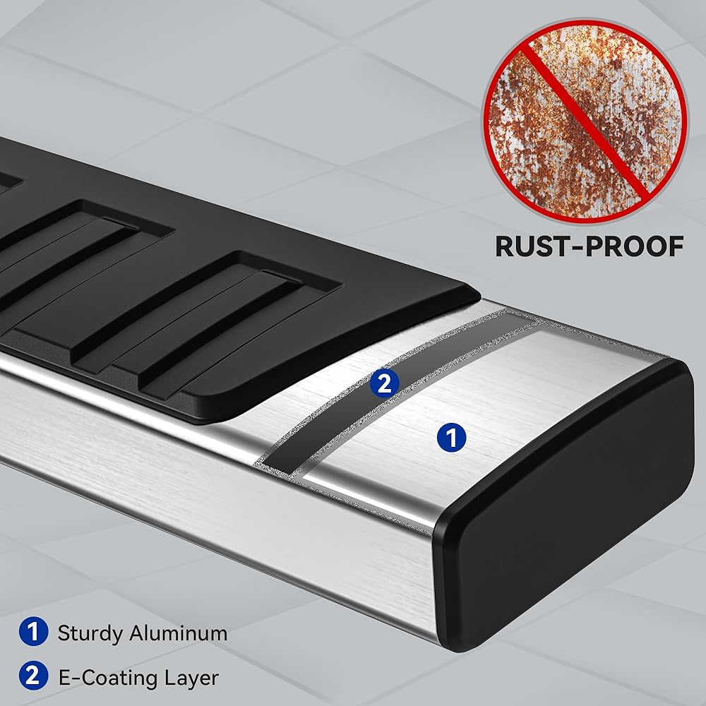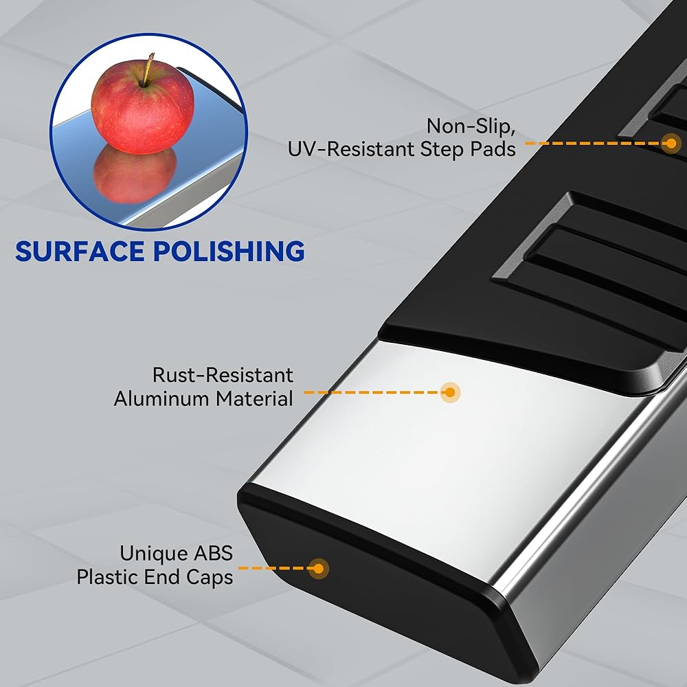 المواد: خطوات جانبية لكابية RAM 1500 Crew ، مصنوعة من سبيكة الألومنيوم الأسود المضاد للتآكل ومنصات بلاستيكية ABS المضادة للانزلاق. مقاومة التآكل من بخاخات الملح وتحمل الأشعة فوق البنفسجية دون تغيير اللون. يمكن لكل جانب التعامل مع ما يصل إلى 450 رطلاً. (200 كجم)