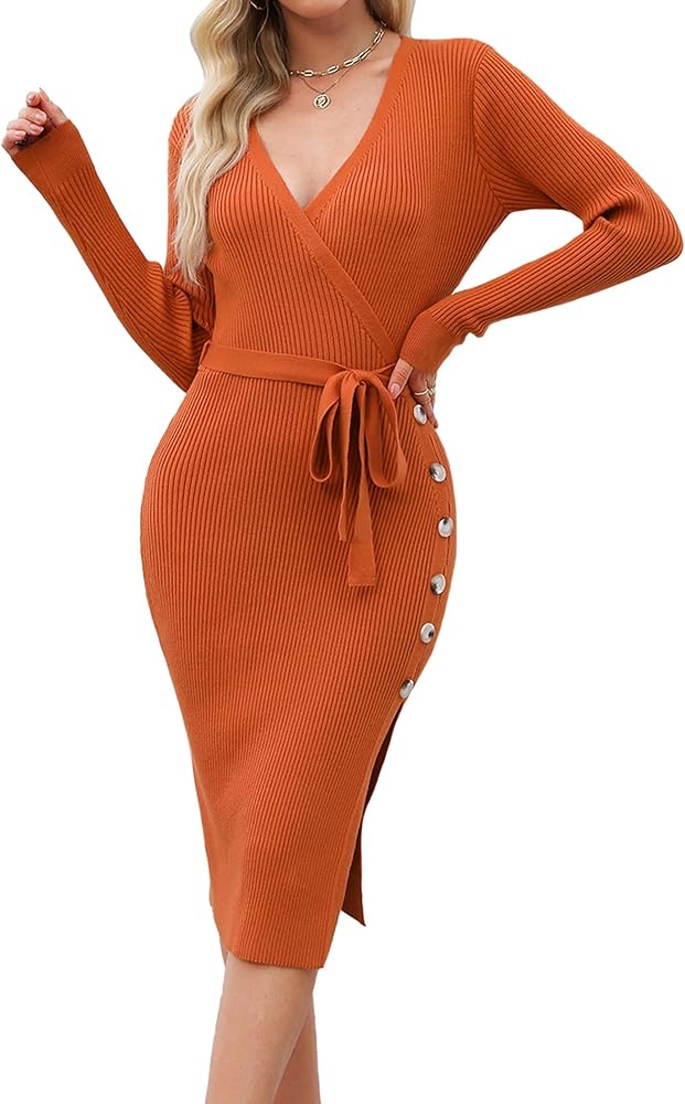 • فستان سترة منسوج: فستان سترة ملفوف برقبة على شكل حرف V مصنوع من نسيج محبوك ناعم وقابل للتمدد، مريح للارتداء للعمل أو الكاجوال.