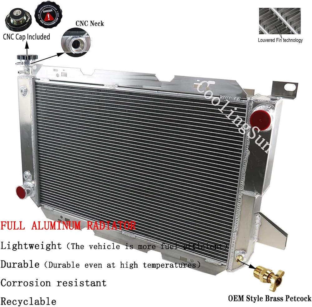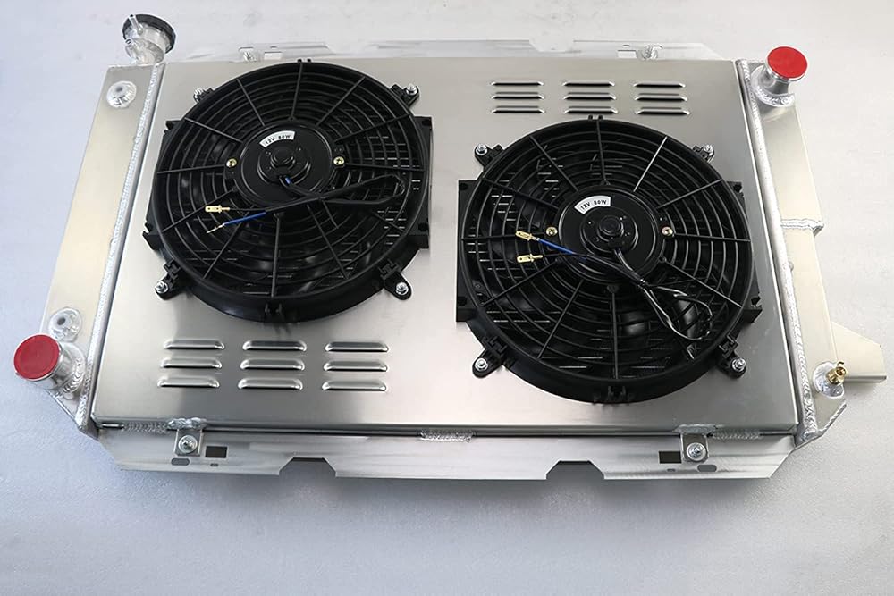 MotoCooling Radiators: Thin Aluminum Fins: Overall durability & corrosion-free property Fan Shroud: Help shield the radiator from the engine heat, increases and directs the airflow. Electric Fan: Save horsepower, be mounted directly, be automatically controlled by a thermostatic temperature switch Compatible with: Ford Bronco 5.0L 1985-1996 Ford Bronco 5.8L 1985-1996 Ford F-150 5.0L 1985-1996 Ford F-150 5.8L 1985-1996 Ford F-250 5.0L 1985-1996 Ford F-250 5.8L 1985-1997 Ford F-250 7.5L 1985-1997 Ford F-350 5.8L 1985-1997 Ford F-350 7.5L 1985-1997 Ford F-450 7.5L 1997 Radiator Details: Type: 3 Core Core Thickness: 1 3/4" Core/ Tank Material: All Aluminum Upgraded Cap: CNC Machined Filler Neck and Cap Upgraded Drain Plug: OEM Style Brass Petcock Drain Transmission Cooler: Included (1/8-27NPT) Automatic and Manual Delivery: Local Delivery Fitment Type: Direct Replacement Performance: Up to 35%-45% Cooling FAN SPEC: Maximum Fan CFM: 2300±200 Fan Diameter X Height X Thickness:12.05" X 12.05" X 2.5" Number of Blades: 10 blades (Plastic) Amp Draw: 12.70 amps Maximum Fan RPM: 2,250 rpm Thermostat Kit: Universal fit for any automotive vehicle and electric fan. Activates by grounding electric fans at preset temperature. 180'F turn-on temperature, 165'F turn-off temperature. 3/8" NPT thread-in brass probe included. Probe typically threads into radiator, water outlet or manifold. Thermostat Relay Kit Instructions: RED + connect directly to battery. WHITE wire to ignition switch power source. BLACK goes to thermos switch. BLUE wire goes to the Fans. Package Include: 1 X 3-Row Aluminum Radiator (Includes Radiator Cap) 1 X Aluminum Shroud 2 X 12"Fan (Includes mounting kits) 1 X Thermostat Relay Kit