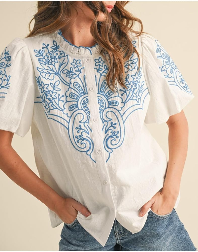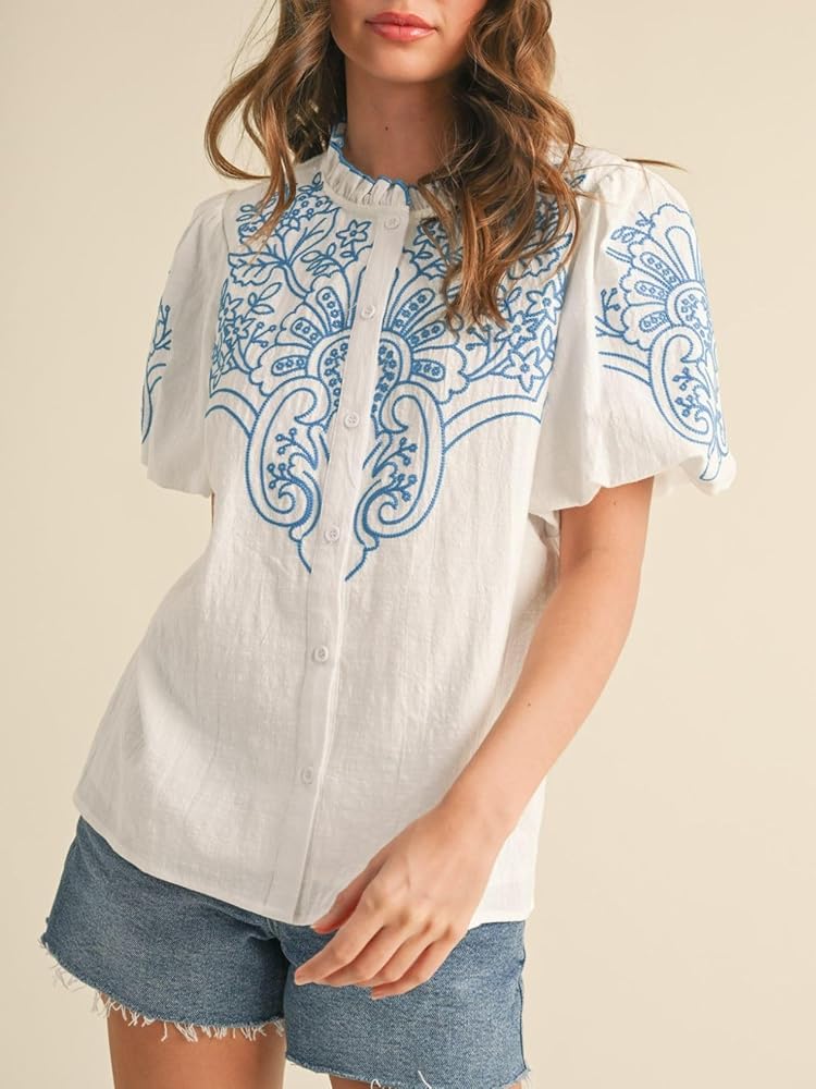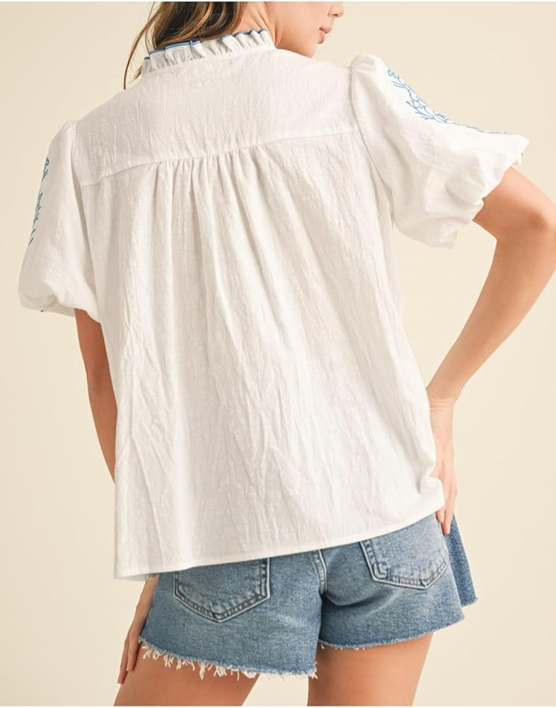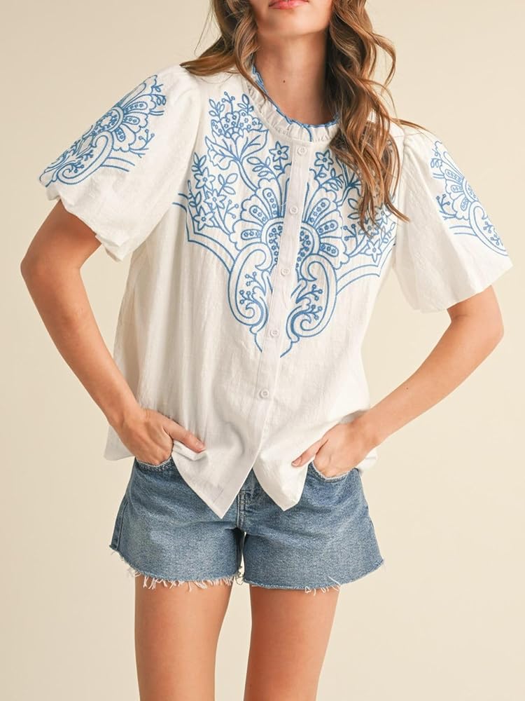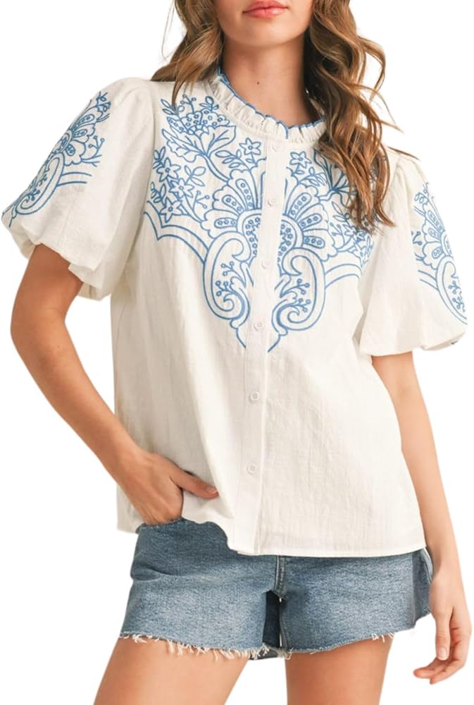 أزرار الأكمام القصير غير الرسمي الربيعي القمصان المطرزة ، والتطريز على صد أمامي ، وأزرار أسفل الأكمام ، وأكمام فقاعة قصيرة مع التطريز ، وملاءمة مريحة ، ناعمة ومريحة مع عدم وجود امتداد