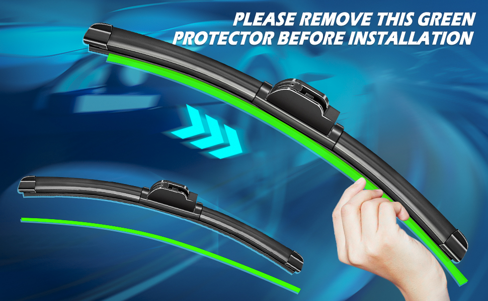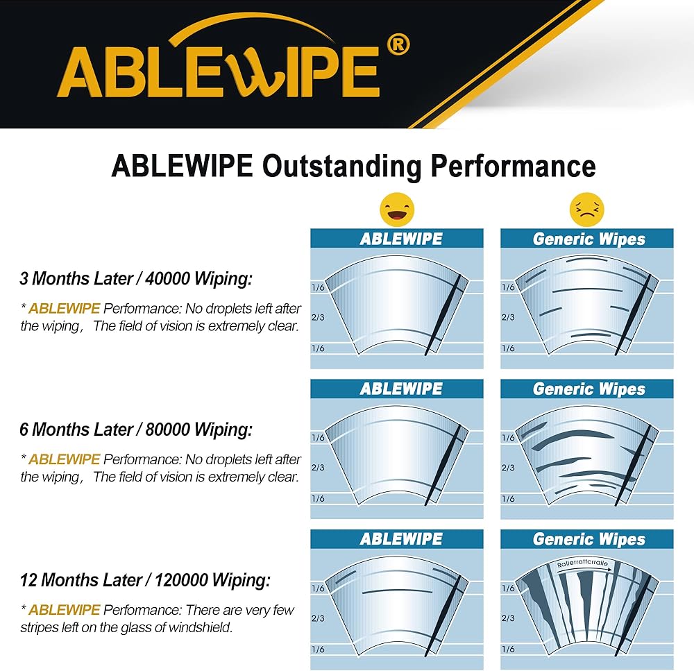 • 0 STREAK COMMITMENT: Ablewipe windshield wiper blades reduces drag, keeps wiping stable. The extra rubber material of the wiper blades is tightly attached to the windshield, without leaving any gaps, sweep away the rain, 180 degrees without dead angle.( Pls take the green blade`s cover off before installation)