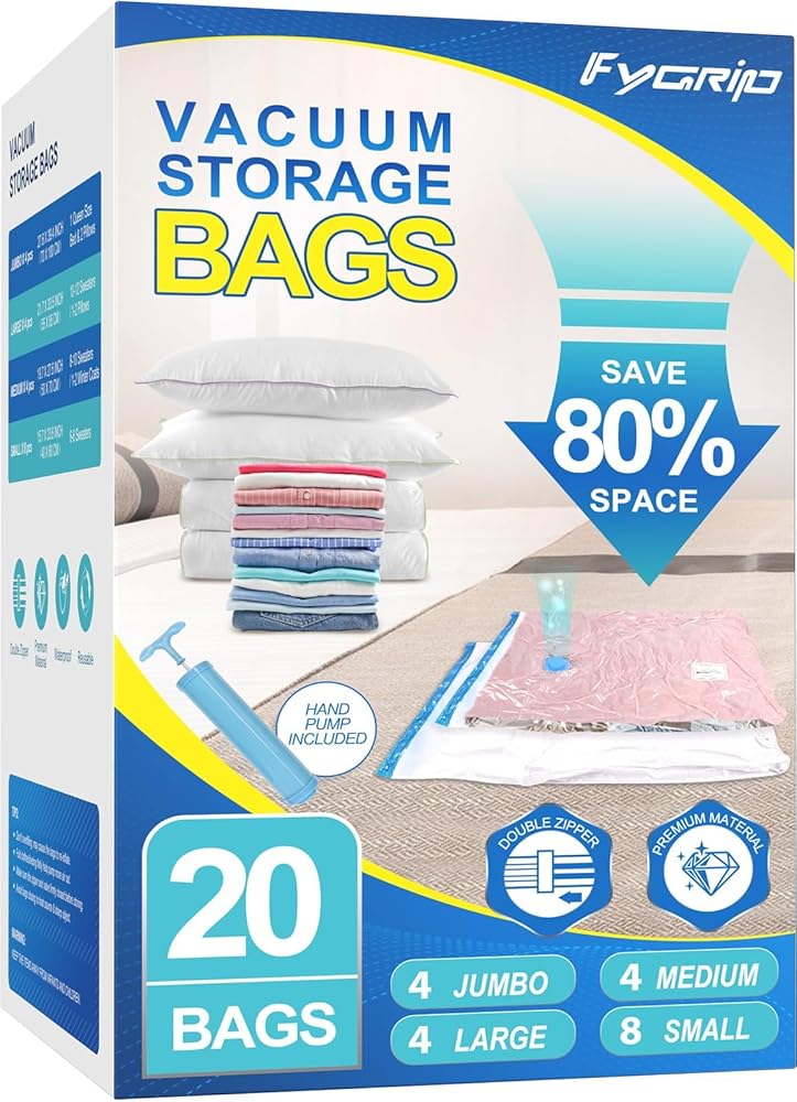 【80% Space Save】: Pack-Seal-Vacuum, with these 3 easy steps, Fygrip vacuum storage bags help you save 80% storage space. They are the game changer for storing your beddin, blankets, clothing and more.