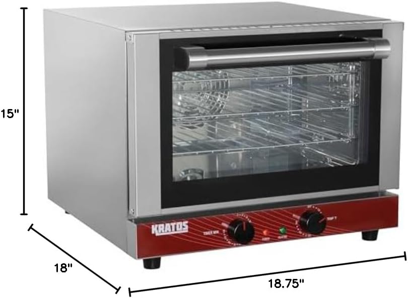 The Kratos 29M-002 Commercial Half-Size Countertop Convection Oven is great for baking medium-sized batches of baked goods, whether your customers are craving cookies, cakes, or any other tasty treat. This convection oven holds up to four 1/2-size sheet pans on its four included wire racks, which fit in a compact, half-size oven that's ideal for smaller kitchens. The Kratos 29M-002 Commercial Half-Size Countertop Convection Oven features adjustable thermostatic controls with a temperature range between 150°F and 500°F. The oven's dual pane glass door retains heat for energy-efficient cooking, and it remains cool to the touch while baking. This convection oven has a heavy-duty stainless steel exterior that's easy to clean and maintain, as well.Main Features of the Kratos 29M-002 Half-Size Convection Oven Include: