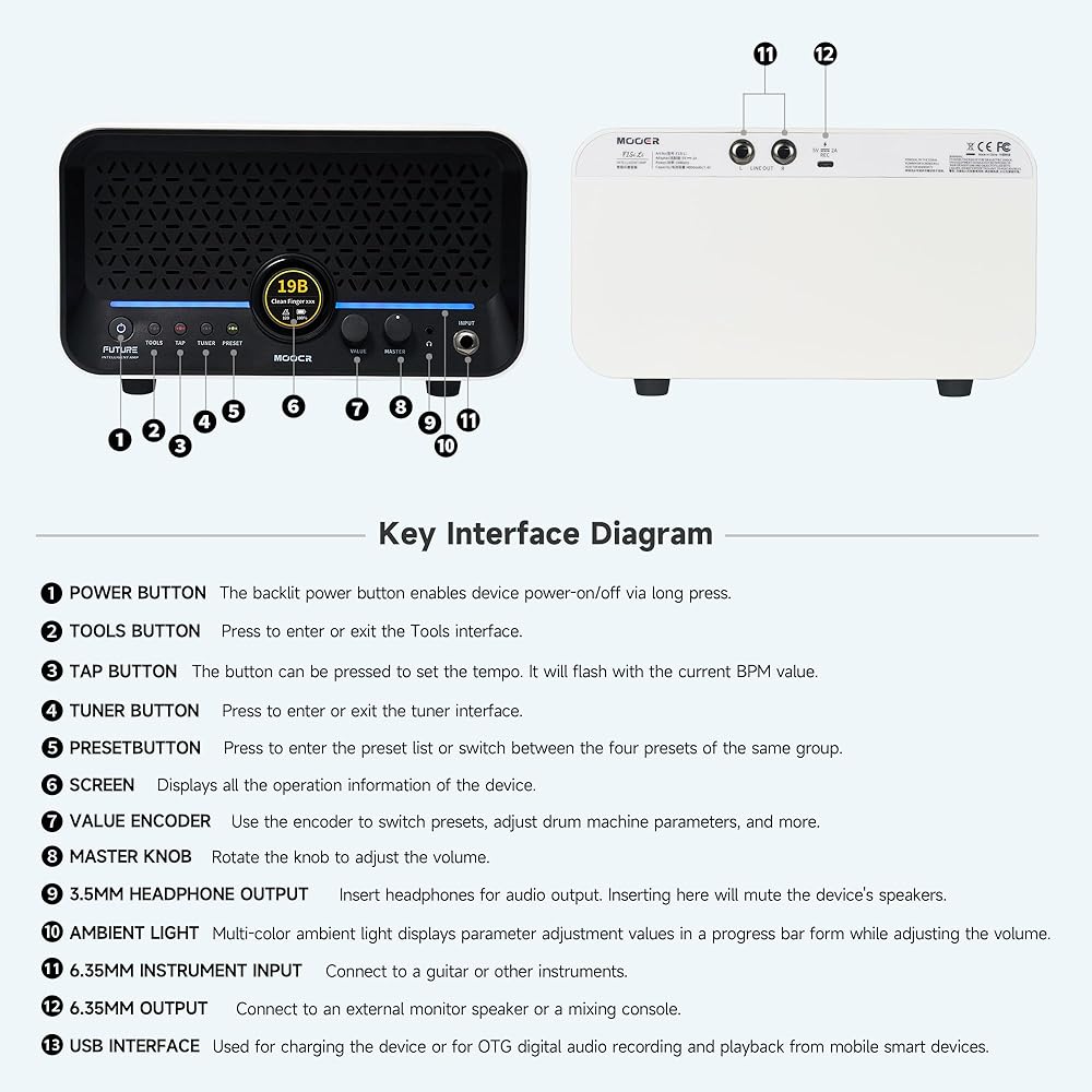 تأثيرات الحرية - 80 فتحات توفير مسبقًا. تم تثبيت مُثبت مسبقًا على الجهاز من 55 من نماذج مكبر للصوت ، حيث أصبح كل منها ممكنًا من خلال تقنية النمذجة غير الخطية المتطورة في MOOER. تكمل هذه 69 نوعًا من التأثيرات ، بما في ذلك وحدات التأخير والتعديل والتردد والمعالجة الديناميكية.