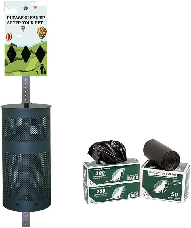 🌱 Includes everything: post, bag dispenser, bags, lidded can, hardware, 400 pet waste bags and 25 odor control waste can liners. Easy to assemble and install.
