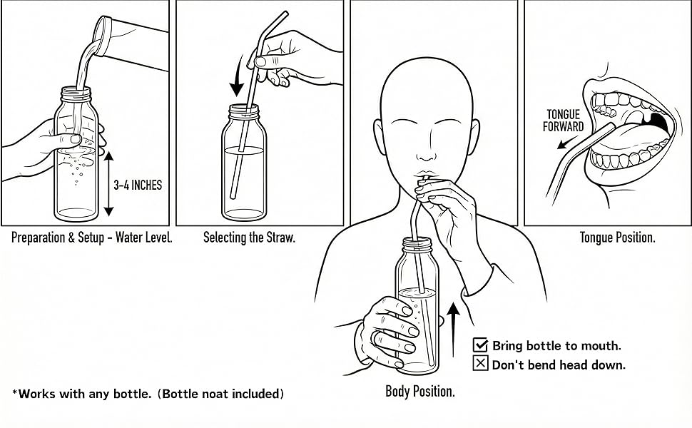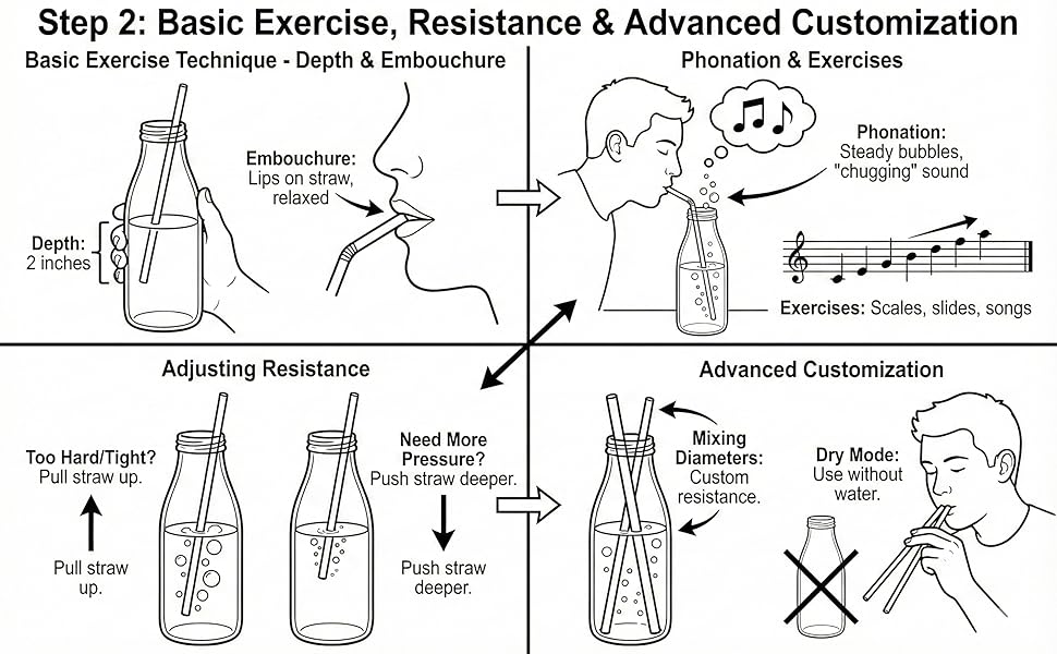 General Preparation Clean tools: Scrub each straw end-to-end with the included brush and a drop of mild soap, rinse in hot water, and air-dry completely before use. Find resting larynx: Pant like a small dog, then a big dog; your resting larynx sits between those two positions. Seal and phonate: Place the straw snugly between your lips (no air leaking through mouth or nose), and phonate steady “whoops” or hum-like vowel sounds into the straw . 1. 5″ × 3 mm Straws (Higher Resistance; Short Length) When to use: Initial warm-ups to activate vocal fold closure and proprioception. Cool-downs after heavy voice use or gigs to relieve tension. Protocol: Phonate a comfortable mid-range vowel for 15 sec, rest 5 sec; repeat 3 times . Do low-to-high and high-to-low pitch glides (10–15 sec each) to explore range without strain . 2. 7″ × 3 mm Straw (Higher Resistance; Increased Back-Pressure) When to use: After warm-up, to deepen semi-occluded back-pressure for balanced vocal fold vibration. To strengthen head-voice coordination and mix voice transitions. Protocol: Phonate sustained pitches (10–15 sec) on “oo” or “ee,” focus on steady airflow and minimal throat tension . Integrate simple singing phrases or scales, keeping the straw just outside the lips, no deep insertion. 3. 7″ × 6 mm Straw (Lower Resistance; Long Length) When to use: Range extension and dynamic control—ideal for exploring higher pitches with less back-pressure. Rehabilitation or recovery when voice feels fatigued—reduces phonation threshold pressure. Protocol: Start with gentle glides at comfortable pitches (10–15 sec), noticing ease of phonation . Move to longer phrases or soft singing through the straw, ensuring a relaxed larynx and consistent airflow