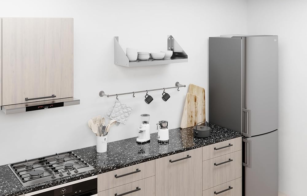 Enhance your organization and efficiency with the Amgood stainless steel wall mount shelf with side guards. Made with high-quality 18 gauge 430 rust resistant stainless steel, this shelf offers durability and sleek aesthetics for any space. Its sturdy construction ensures steadfast support for an array of items, spanning from spices and ingredients to small kitchen appliances and cleaning supplies.