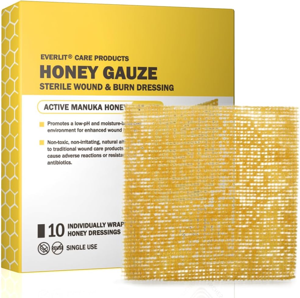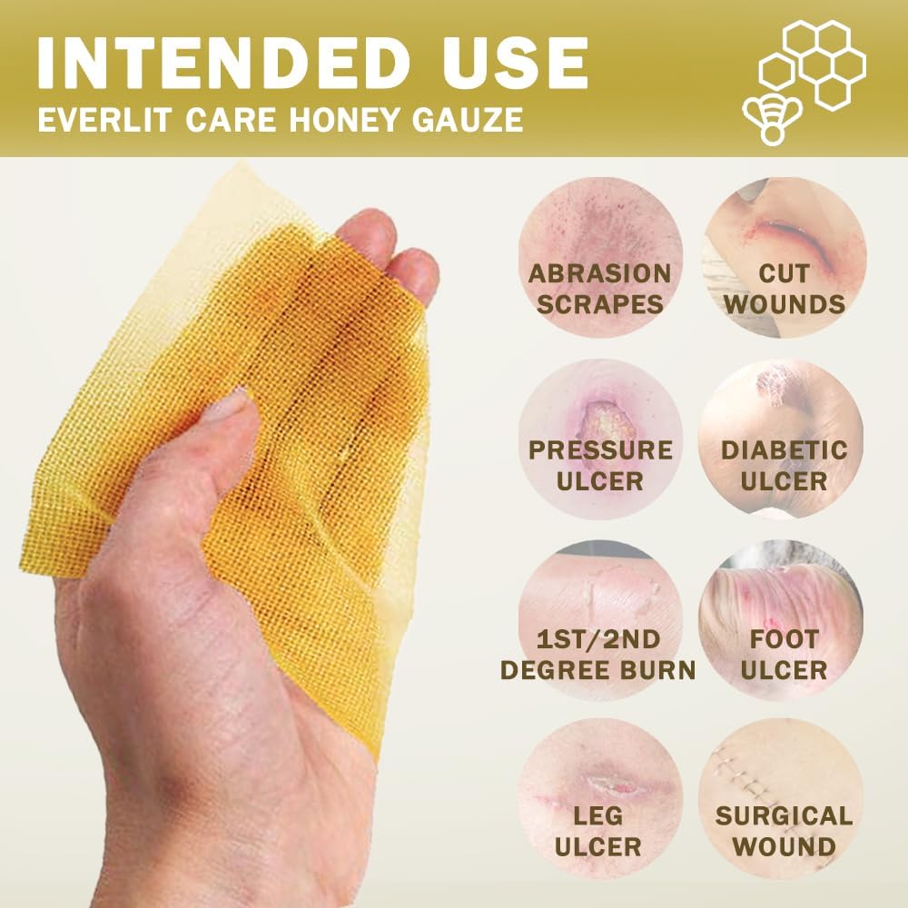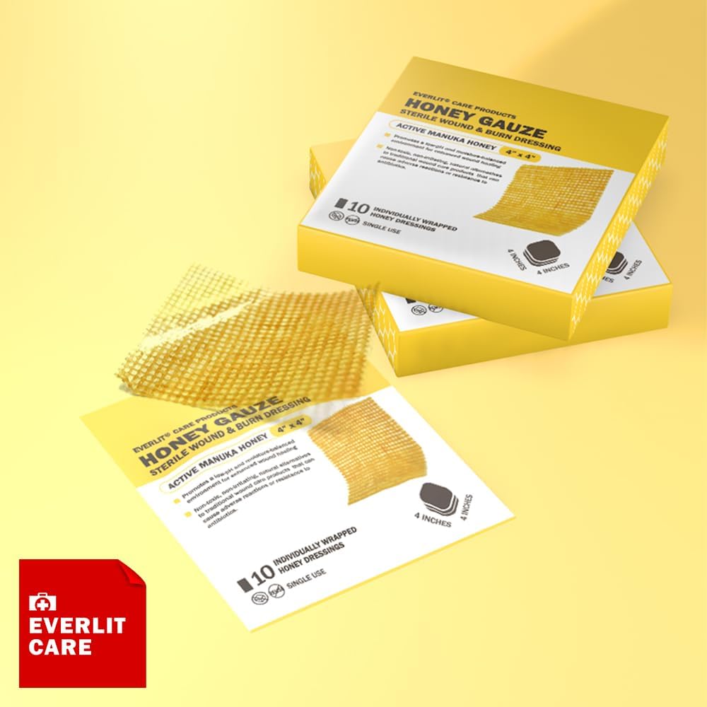 Manuka Honey Wound Dressing from Everlit Care is a sterile gauze dressing, constructed from a soft, highly breathable material designed to conform comfortably to the skin. It is infused with a high concentration of pure, unadulterated Manuka honey, offering a natural, drug-free solution for maintaining a moist wound environment. The gauze is designed to minimize discomfort during wear and removal. It remains moist without drying out, helping to reduce dressing change pain and prevent adherence to the wound bed. The open-weave structure promotes airflow while supporting an optimal healing environment. Suitable for individuals seeking a natural, soothing approach to wound management, this dressing combines effective moisture retention with ease of use and gentle application.