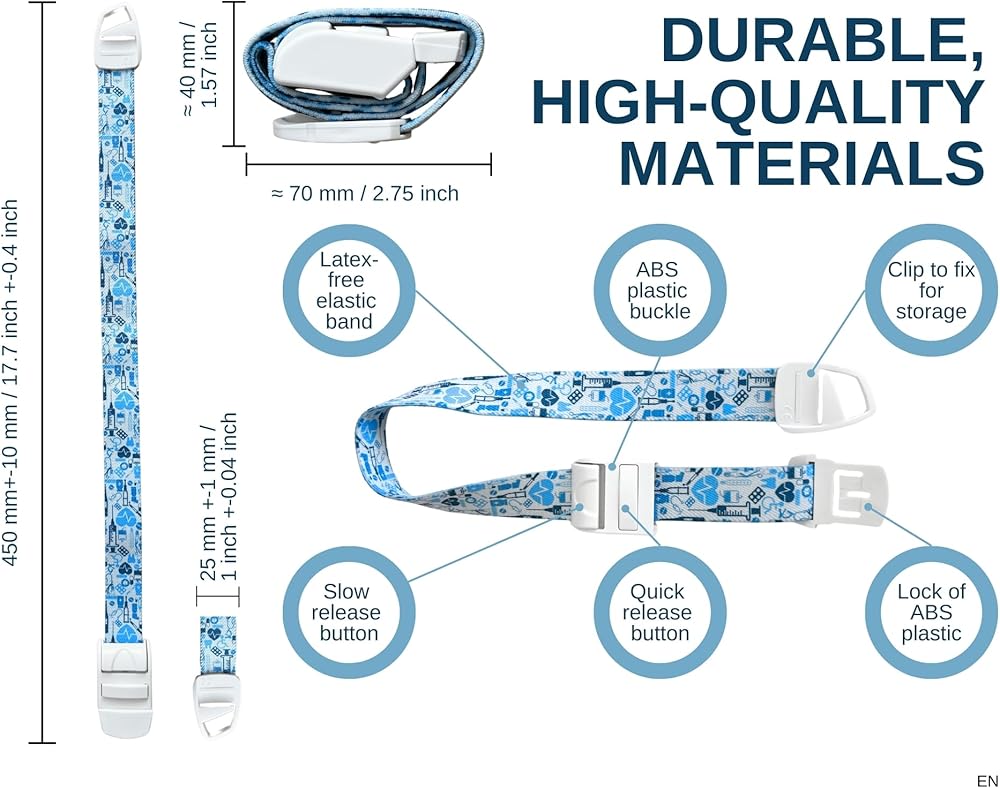 شريط البوليستر الخالي من اللاتكس ، ناعم على الجلد ولكن مصنوع ليستمر. الطول القياسي: 450mm10mm العرض: 25mm1mm. مشبك مصنوع من البلاستيك ABS. إنها أداة ممرضات وملحقاتها وهي هدية احترافية مثالية. سيتم ملاحظة أنماط غير تقليدية وملونة من قبل الزملاء والمرضى.
