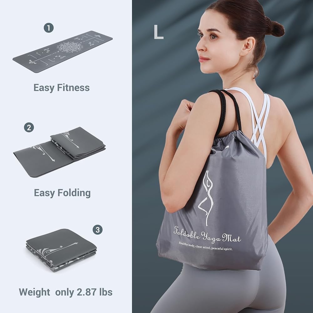 FOLDABLE AND PORTABLE DESIGNL: The revolutionary folding design, makes the Avoalre travel yoga mat easy for Daily Use. Once unfolding, the yoga mat lay flat steadily on the floor without rolling up. You can also easily fold it put it into the storage bag included, and then carry the packable yoga mat with the bag everywhere.