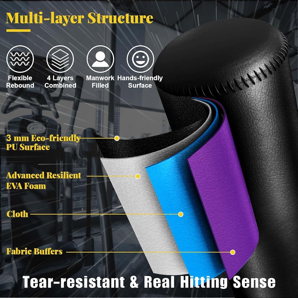 【Heavy Duty Boxing Bag】: Constructed with multi-layer construction, each layer has been carefully engineered: stainless steel tube prop, eco-friendly fabric buffer, high-density EPE foam, 3mm Premium PU Leather. Generates tear-resistant, fast rebound, good hardness balance and hands protective surface.