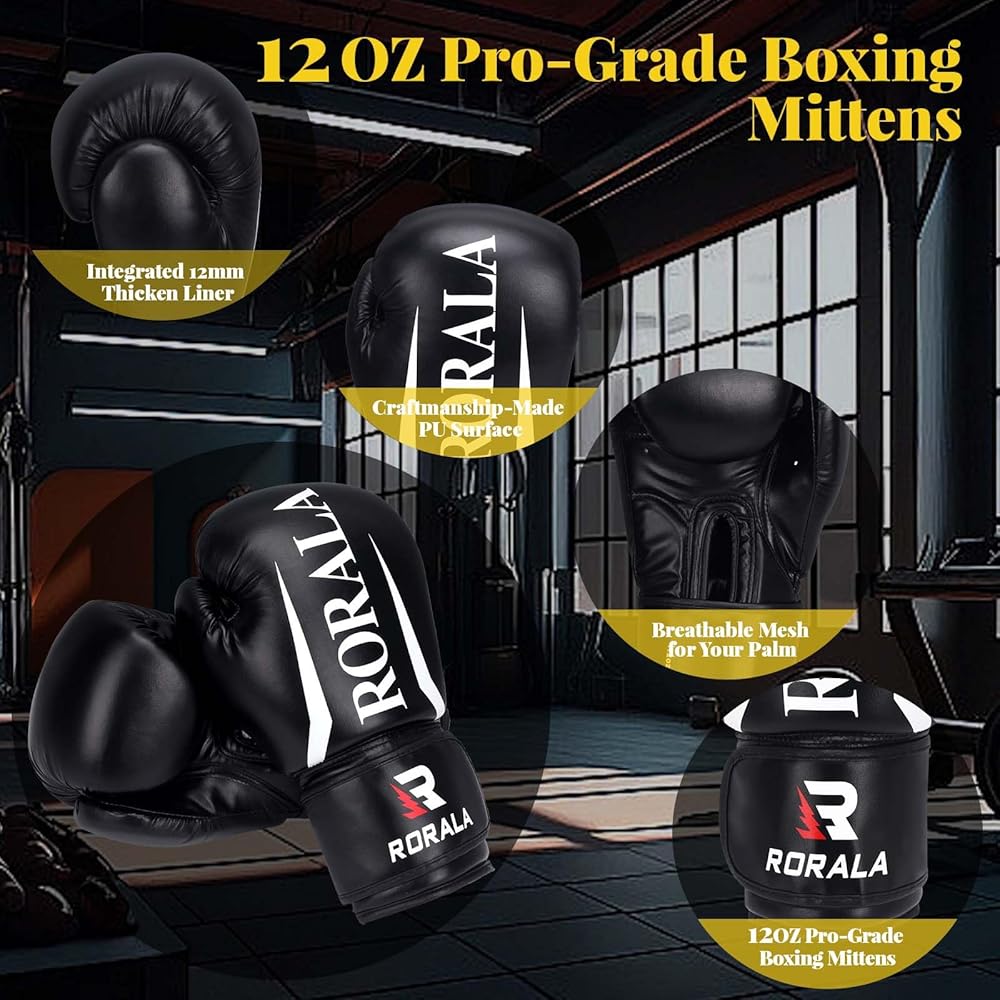 【Large Boxing Gloves】: Constructed with 10mm thicken high-density EVA foam and pre-curved anatomic hand design, RORALA advanced 12OZ boxing gloves create the best protection for your hands with shock absorption. Make sure you can hit with confidence! 24 hours customer service standby, solve your problems Quickly.