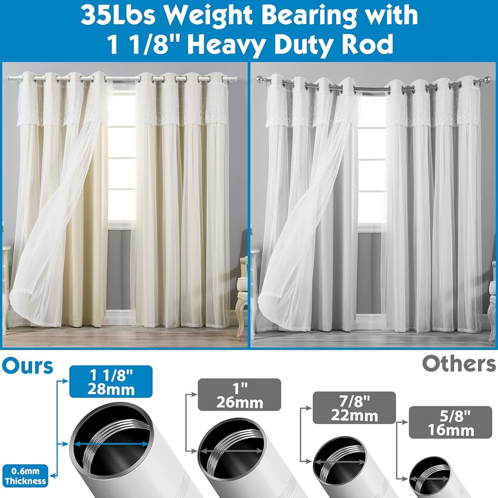 • قضبان ستارة شديدة التحمل: 1 1/8 بوصة (28 مم) قضيب، صلابة قضيب الستارة الأبيض هذه كبيرة بما يكفي لحمل الستائر السميكة حتى 35 رطلاً. مثالية لصنع قضبان أطول للنوافذ الأكبر بدون انحناء