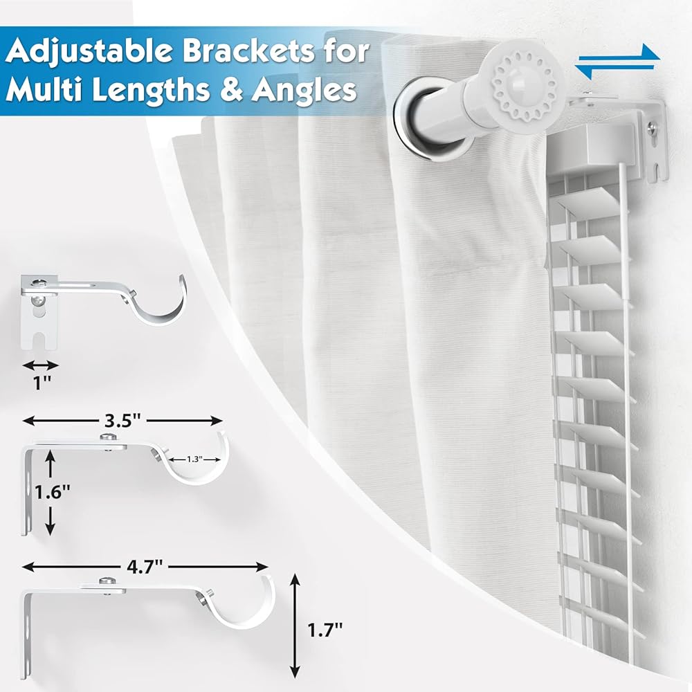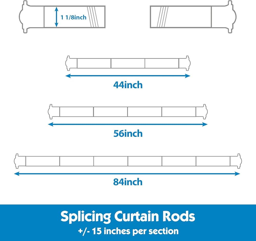 • قضبان ستارة قابلة للتعديل: أضف أو أخرج أقسام للوصول إلى المقاس بين 28 إلى 44 بوصة. التصميم الملولب أكثر متانة ويجعل قضبان الستارة أكثر متانة من خيارات التصغير