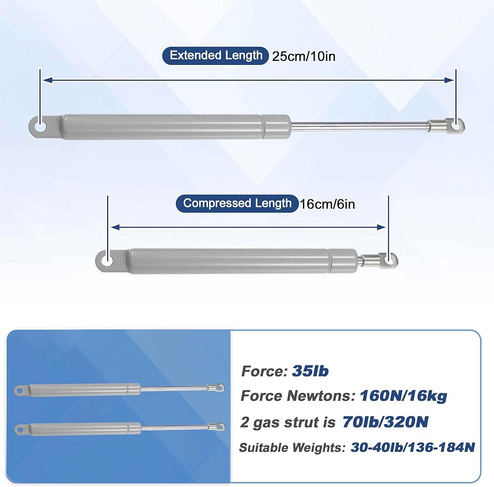 دعامات الغاز 10 بوصة: الطول الممتد: 10 بوصة ، طول مضغوط: 6.5 بوصة ، القوة: 45ib/200n/20kg ، يتراوح نطاق الوزن بين 38 ~ 52 رطل/169 ~ 231n.