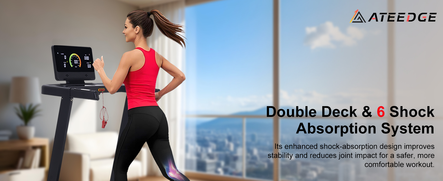 【Spacious 18.5”Running Belt with Shock Absorption】This treadmill for home features an 18.5" x 45.5" extra-wide belt, providing ample space for a comfortable workout. Advanced shock absorption minimizes joint impact and enhances stability for a smoother run.