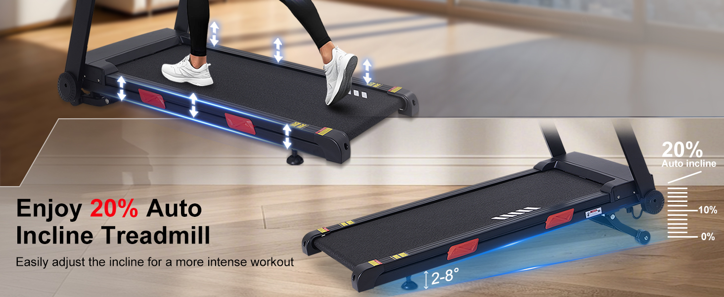 【20% Auto Incline Treadmill 】Elevate your workout with up to 20% incline (2-8°) for intense training. With 36 built-in workout programs, simulate real-world terrain, challenge your endurance, and maximize calorie burn.