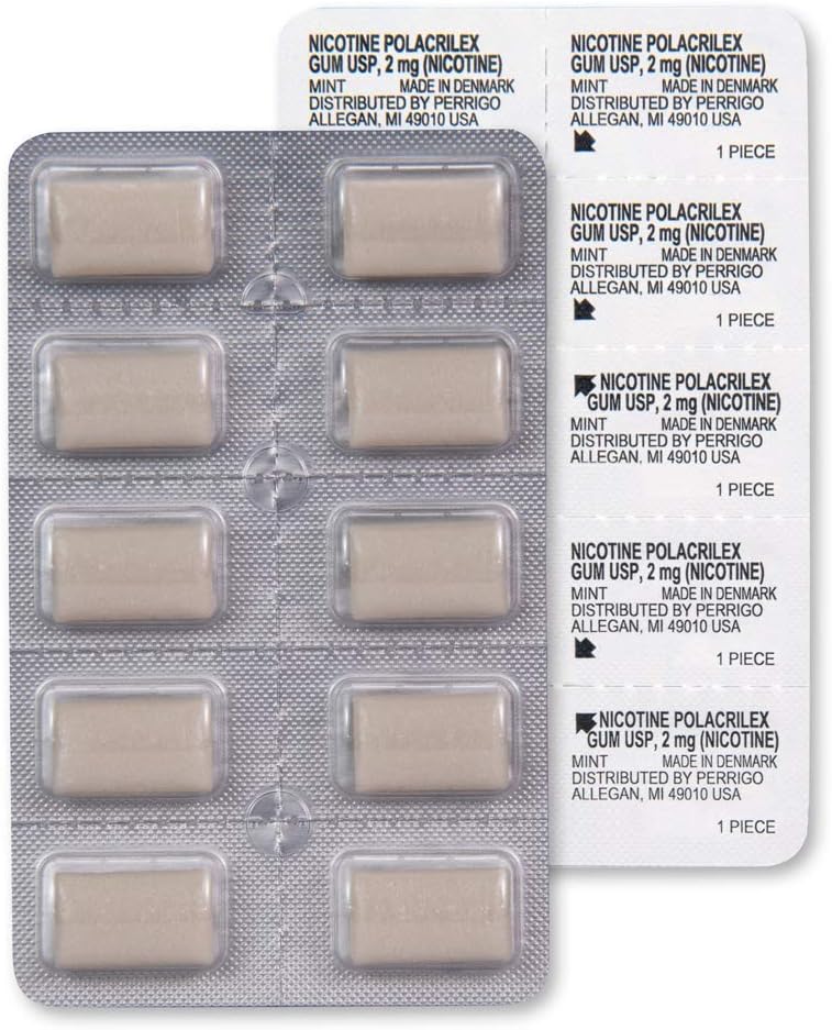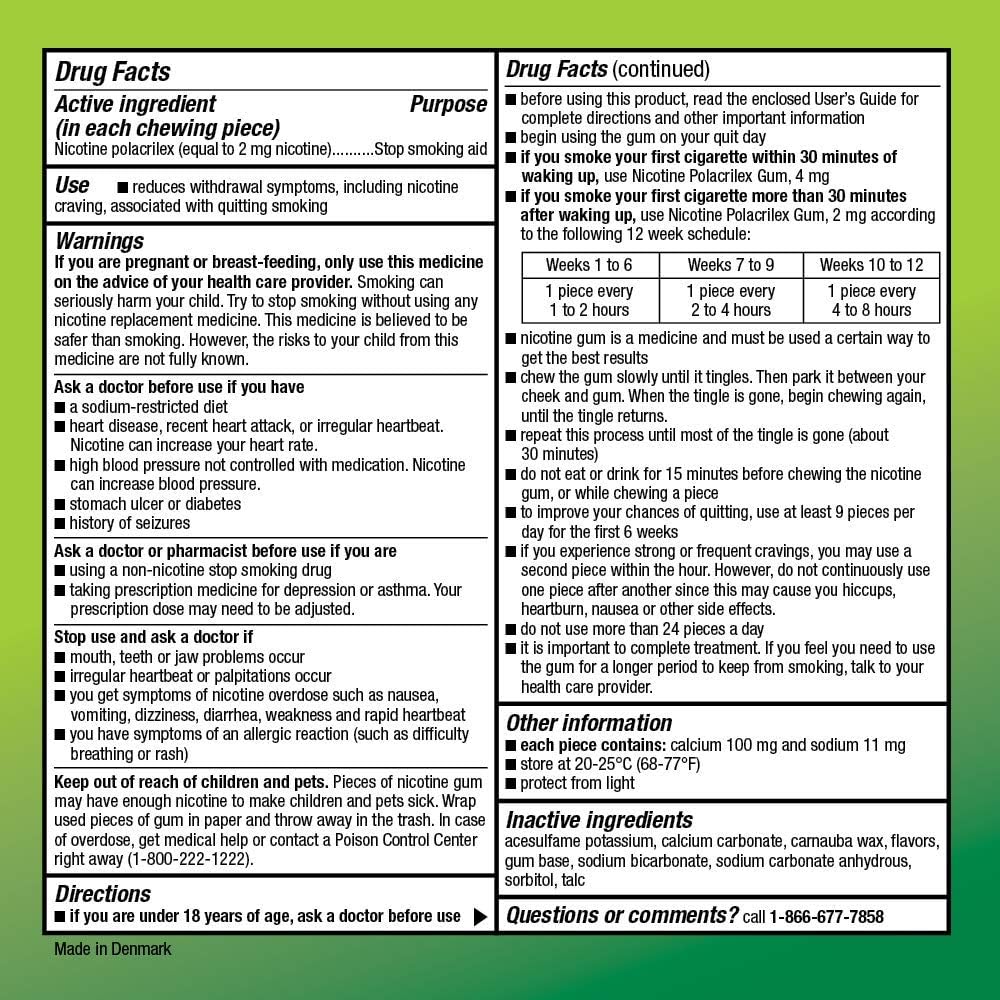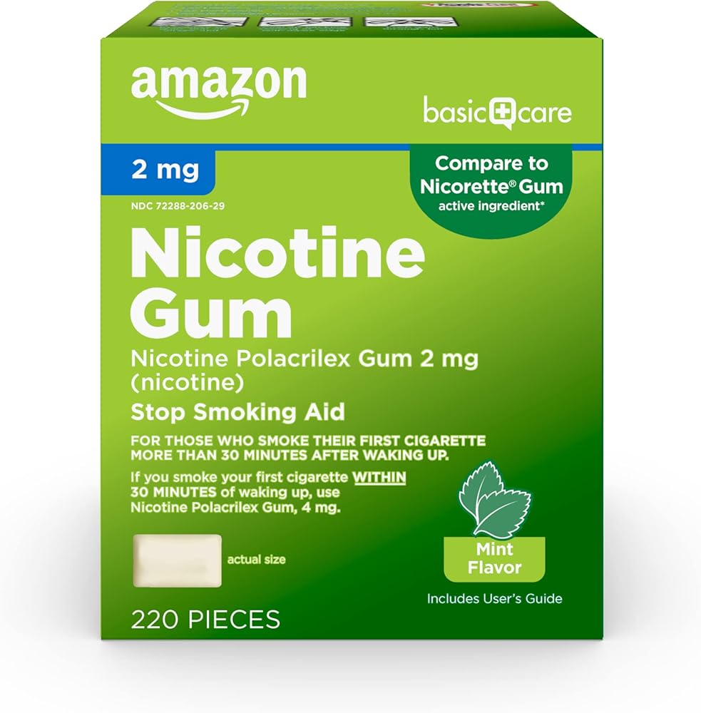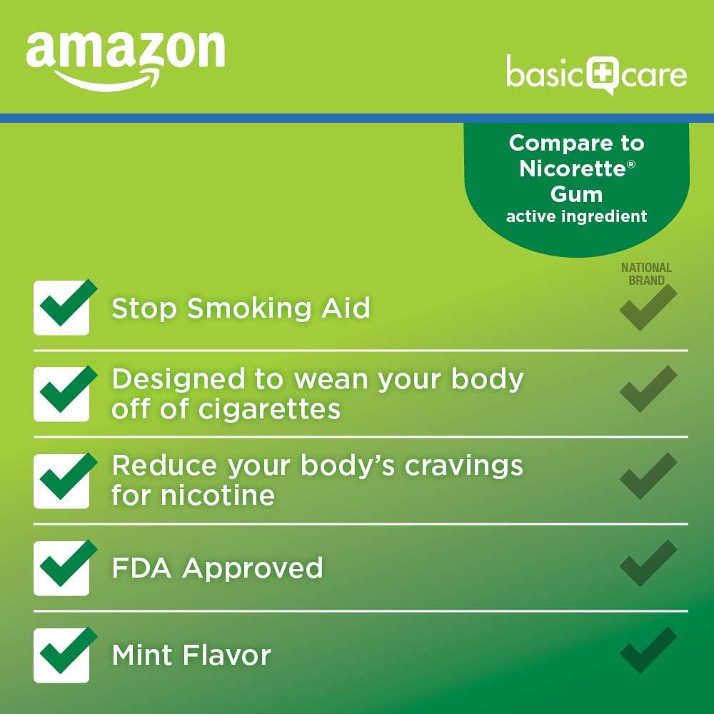 Compare to Nicorette Gum active ingredient. Amazon Basic Care Nicotine Polacrilex Gum, 2 mg (nicotine), Mint Flavor, is a stop smoking aid for those who smoke their first cigarette more than 30 minutes after waking up. This product is part of a Nicotine Replacement Therapy (NRT), designed to wean your body off cigarettes. It helps regulate, control and gradually reduce your body's nicotine cravings. Made in Denmark.