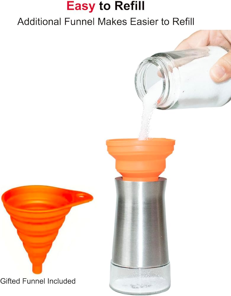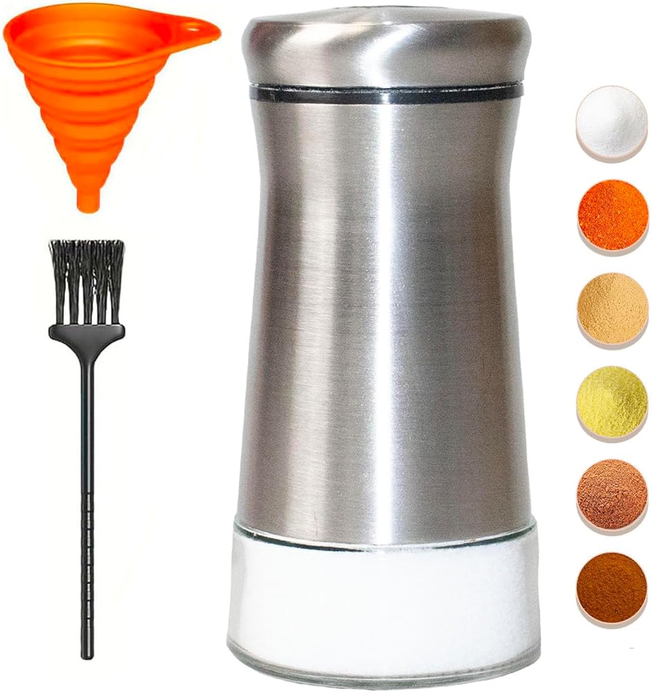 • سهل الاستخدام: يقف طوله 4.5 بوصة ويمسك حتى نصف كوب من التوابل ، هذا الشاكر مثالي للطهي اليومي دون عبوات ثابتة. يسمح القمع المضمّن بملء سريع وعدم الرسائل ، مع الحفاظ على نظافة كونترتوب في جميع الأوقات.