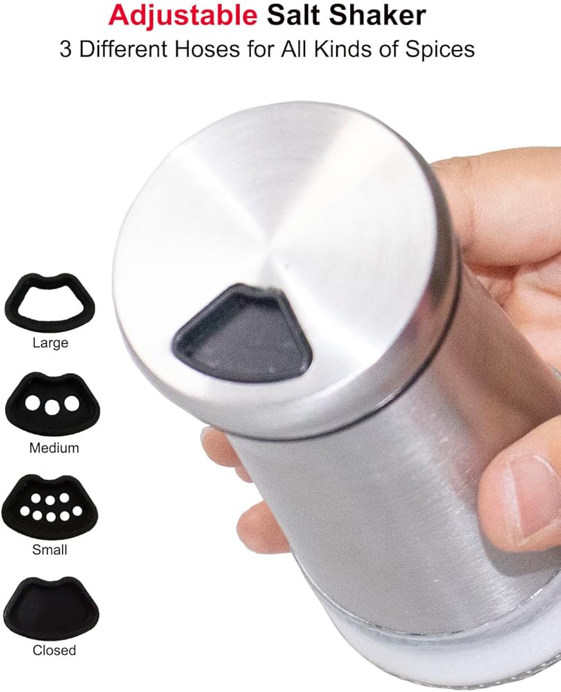 شاكر الملح أو شاكر الفلفل مع ثقوب صب قابلة للتعديل ، 4.5 بوصة زجاجية صغيرة توابل بتوابل بتوابل مع غطاء الفولاذ المقاوم للصدأ لملح الهيمالايا ، طاولة ناعمة ملح البحر ، الفلفل الأسود