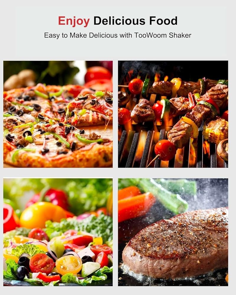 • استمتع بلحظات لذيذة معًا: استخدم موزع التوابل Toowoom لتتميز الأطباق المفضلة لديك واستمتع بوجبات لذيذة مع العائلة. املأه بالملح والملح الوردي في الهيمالايا والفلفل الأسود ومسحوق الثوم ومسحوق البصل والفلفل الحلو والسكر.
