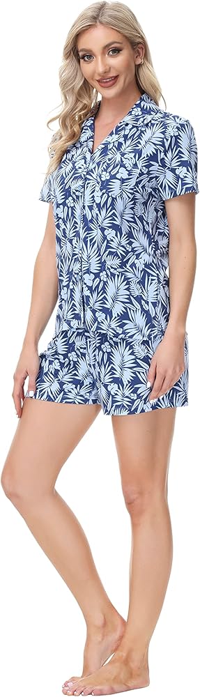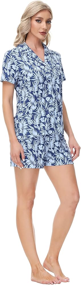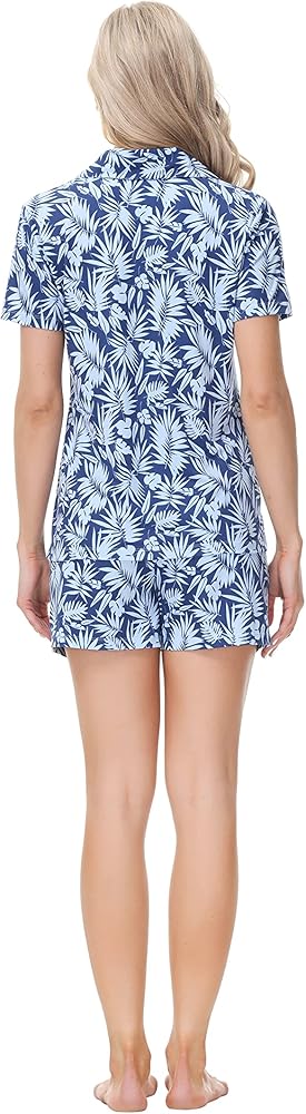 مجموعة ملابس نوم نسائية مريحة ومريحة، قميص بأزرار مع ياقة كلاسيكية وسروال قصير متطابق؛ تصميم كاجوال ومريح مع مادة ناعمة لارتداء مريح في أي مناسبة.