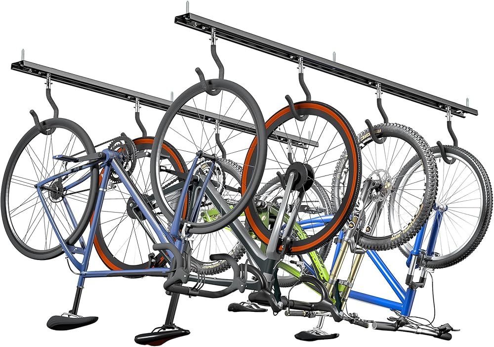 تخزين آمن ومريح: يتم تغطية السنانير بأكمام مطاطية سميكة لحماية العجلات وتعزيز قبضة للتخزين الآمن. يتم تخزين كل دراجة بشكل منفصل ، مما يتيح سهولة الوصول دون إزعاج الآخرين - مثالي للاستخدام اليومي