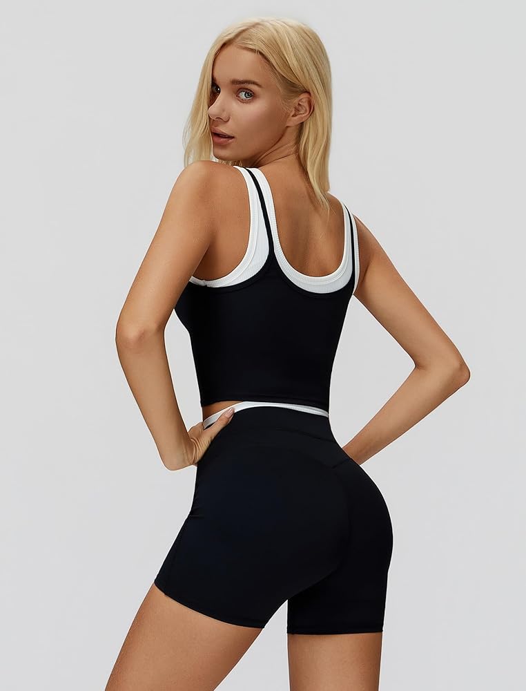 Racerback Color Block Workout Tank Top with Built in Bra: open back longline basic yoga tops, color block sleeveless athletic tank tops, racerback back gym top sports bra with built in bra, removable padded gym sets, convenient to adjust, replace or wash. gym sets for women 2 piece, gym sets woman, two piece gym sets for women, golf outfits for women 2 piece sets,