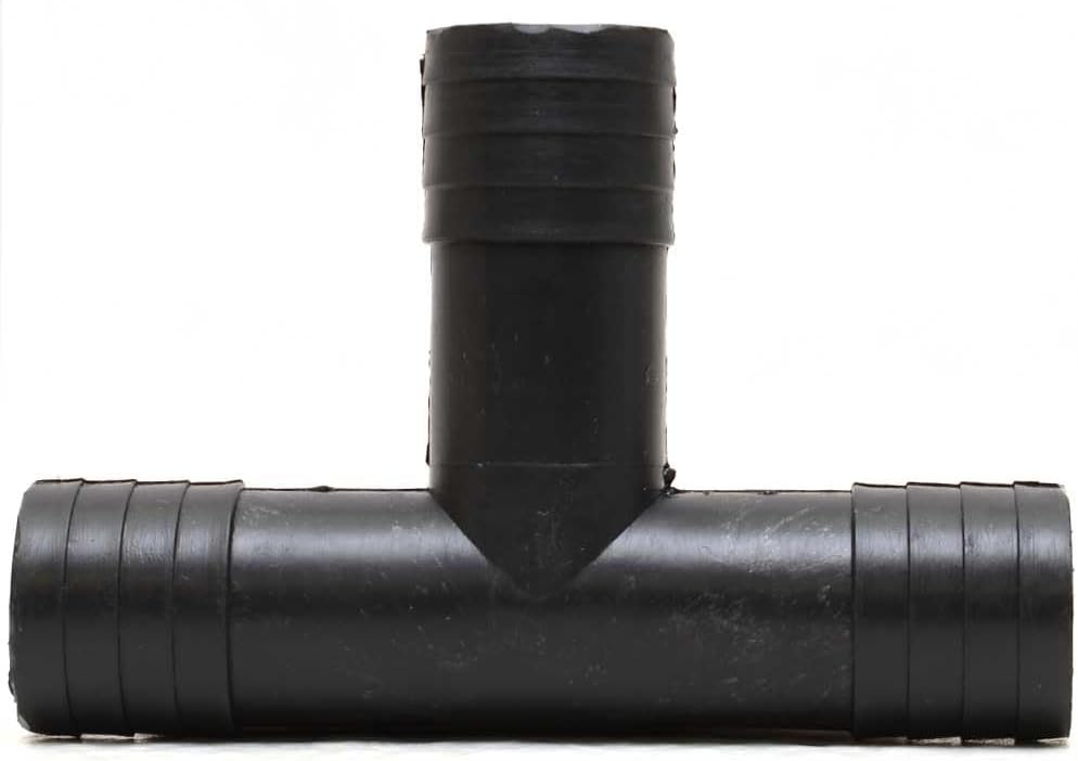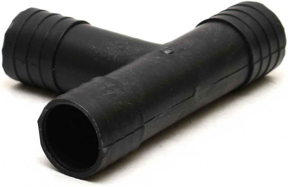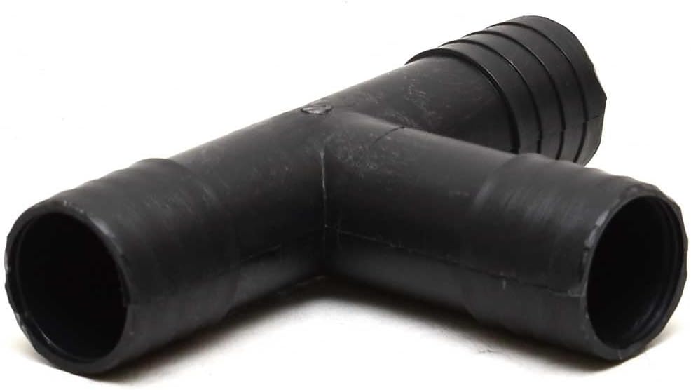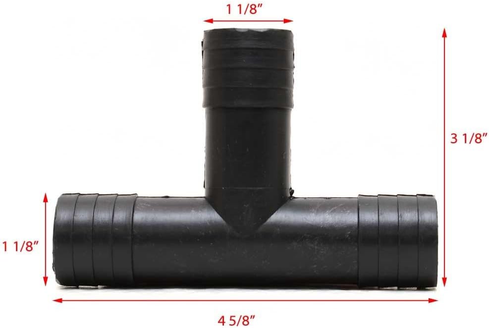 This fitting is constructed out of a black plastic. Measures approximately 4 5/8" W x 3 1/8" H x 1 1/8" D overall and features (3) 1 1/8" OD barbed hose connections.